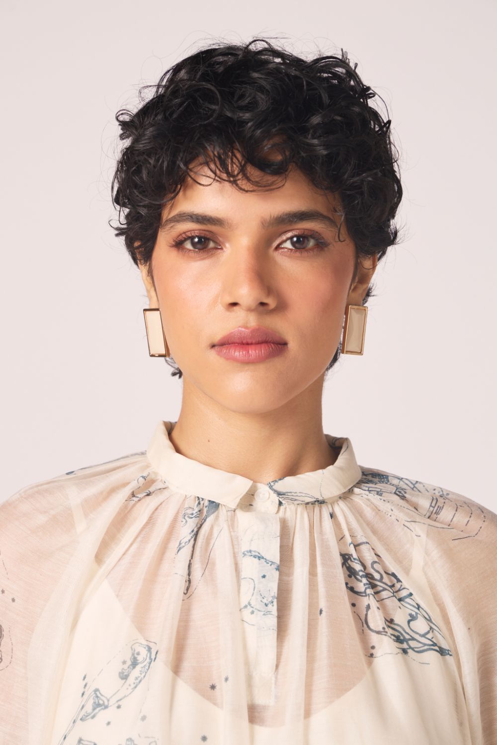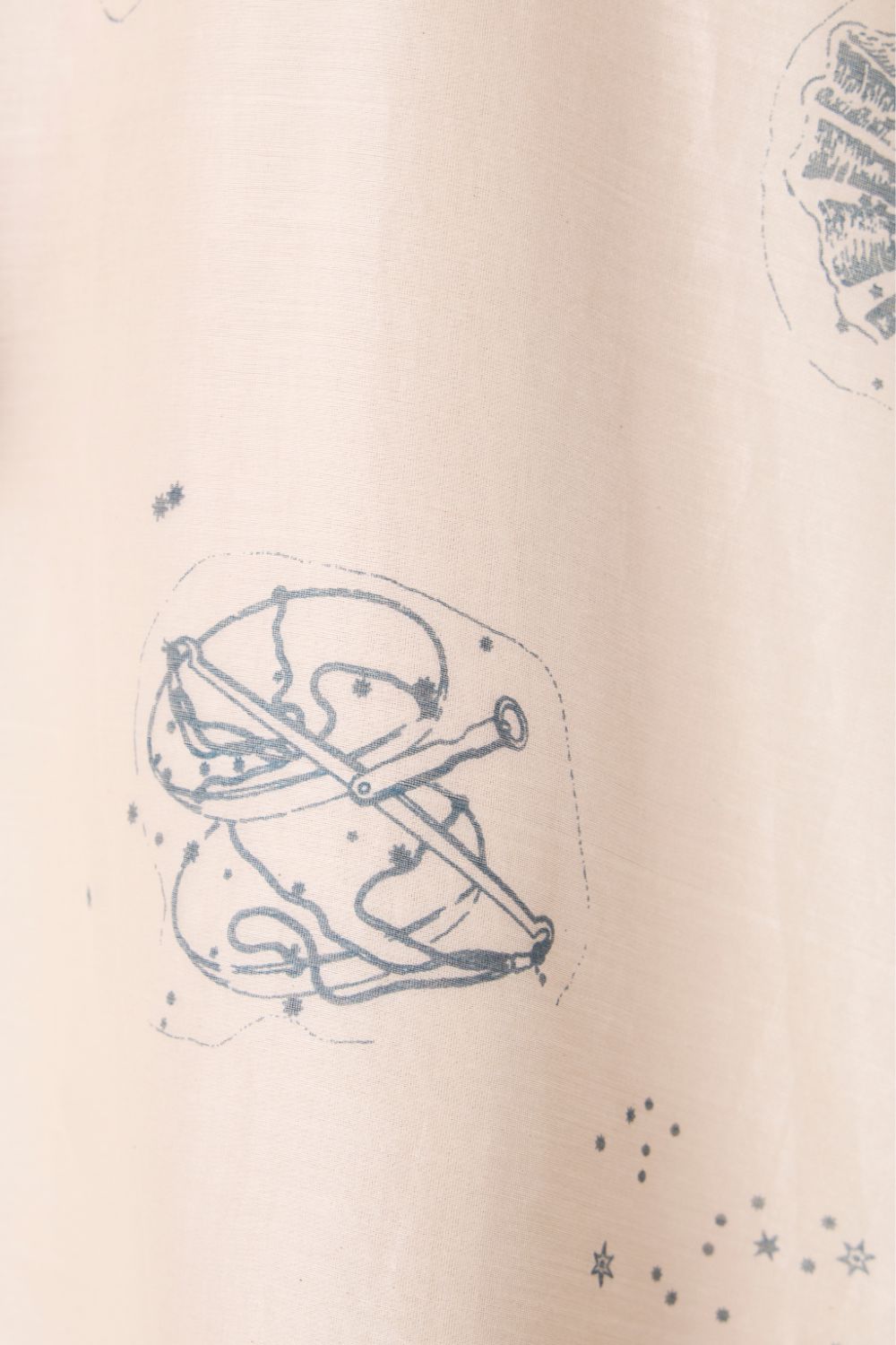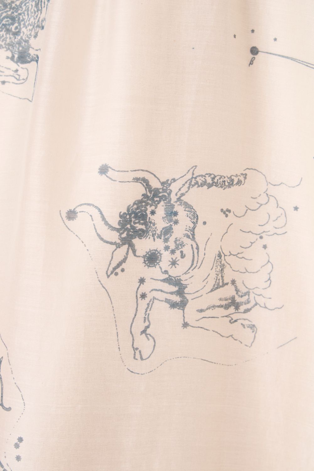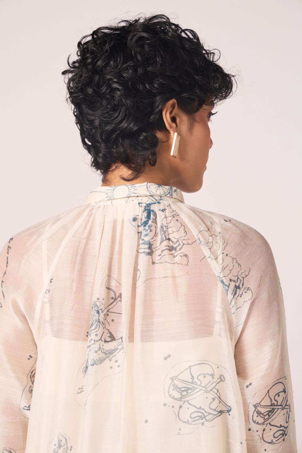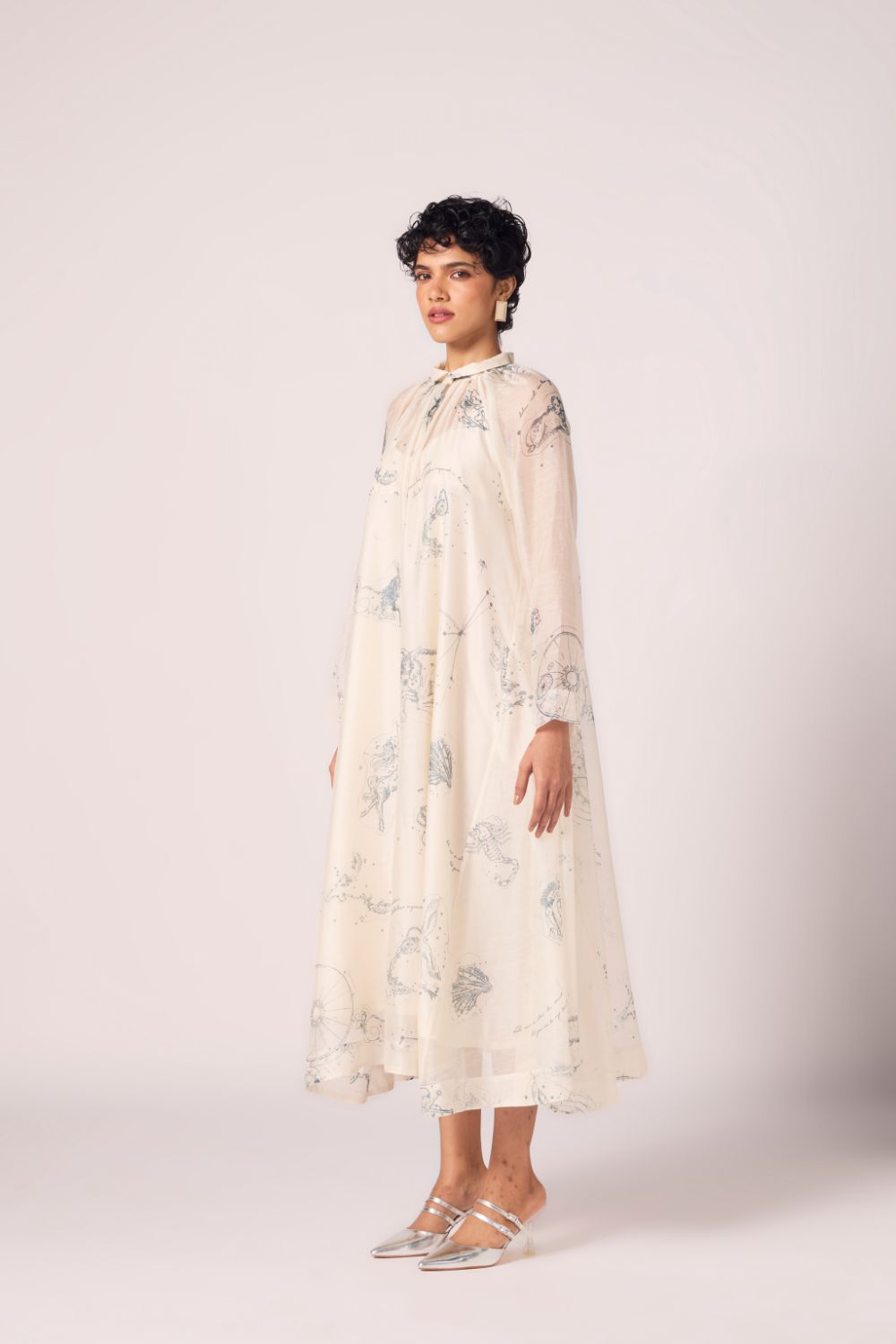 Airy Chanderi carries zodiac-inspired print with quiet elegance. Gentle gathers at the neckline meet a slim collar, while raglan sleeves fall fluidly to the wrist. Designed with in-seam pockets and a slip, it blends ease with refinement.