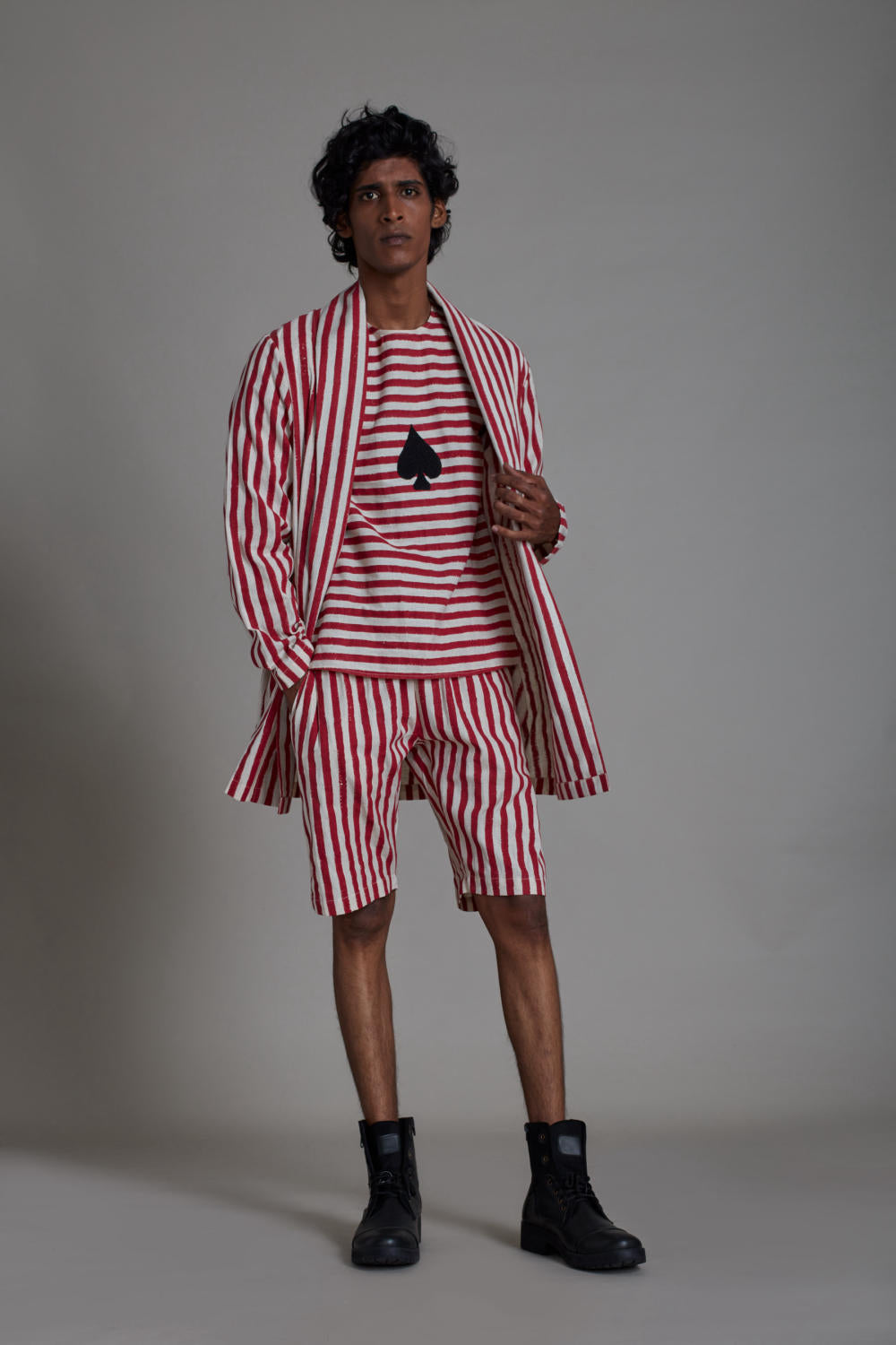 CO-ORD SET OF 3: Casual yet comfortable this set is perfect for a casual day out. This set comes with striped hand woven cotton shirt with rib detailing and patch at the center, comfortable and airy striped shorts and a shawl collar jacket .Style this versatile set together or separately. (set of 3).