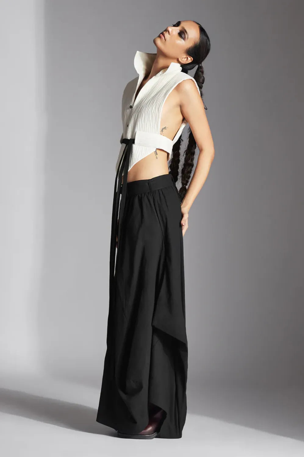 Chola’s universe begins with thoughtful materials. Recycled cottons, post-consumer fabrics, and free-cutting techniques come together in a kind of mindful choreography—one that honours form without creating waste, and prioritises movement over rigidity. This is clothing that feels lived-in yet architectural; pared-back yet quietly avant-garde.