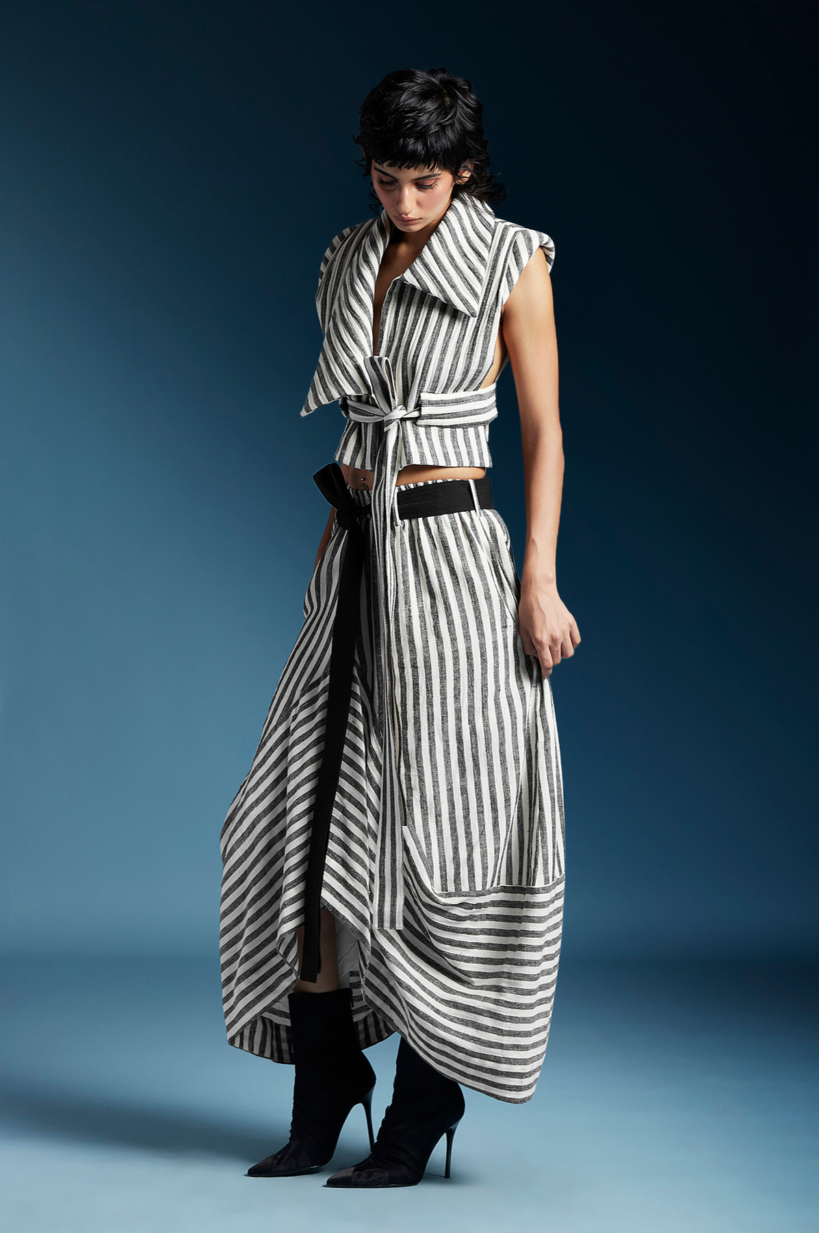 Chola’s universe begins with thoughtful materials. Recycled cottons, post-consumer fabrics, and free-cutting techniques come together in a kind of mindful choreography—one that honours form without creating waste, and prioritises movement over rigidity. This is clothing that feels lived-in yet architectural; pared-back yet quietly avant-garde.