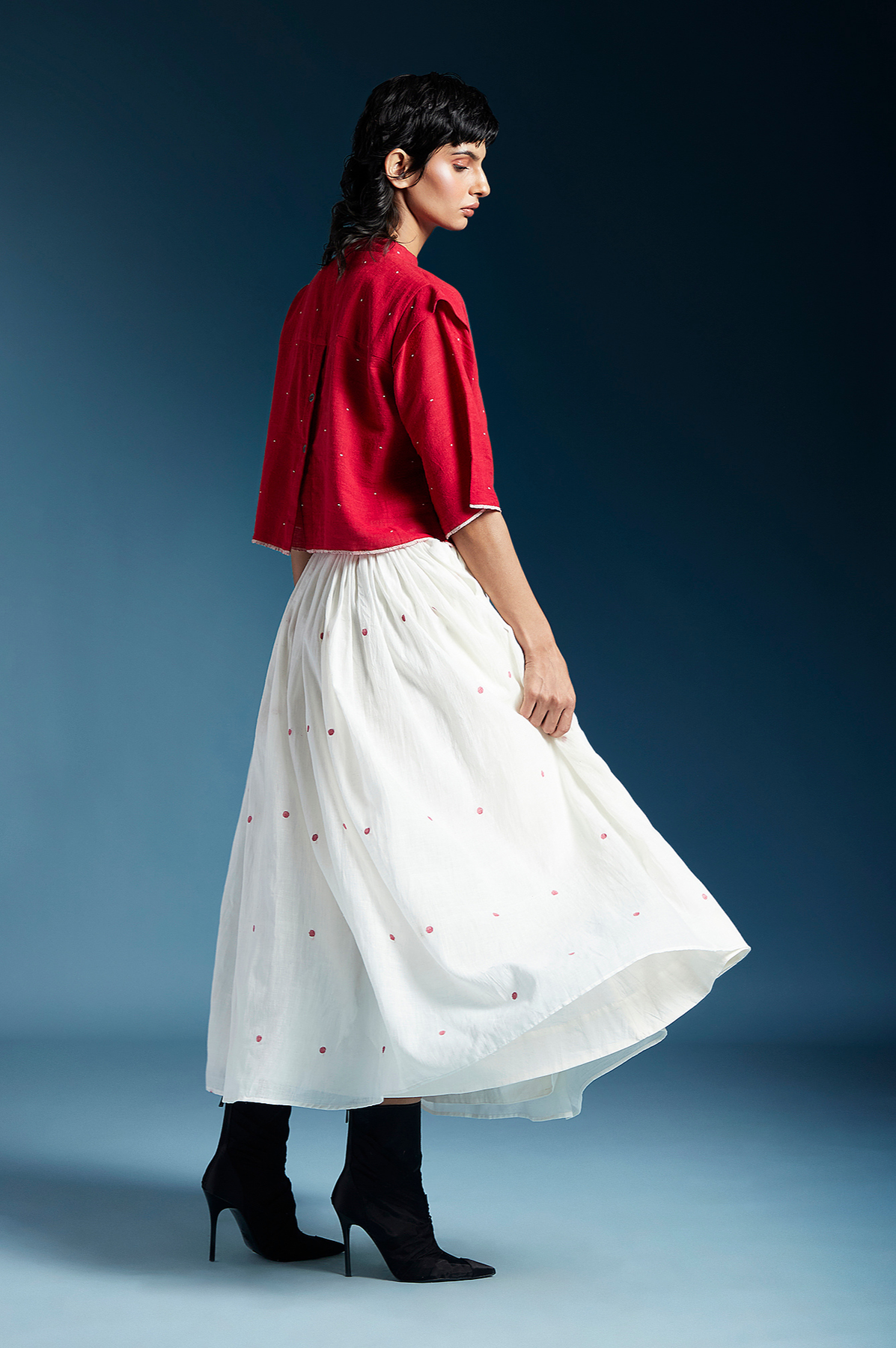 Chola’s universe begins with thoughtful materials. Recycled cottons, post-consumer fabrics, and free-cutting techniques come together in a kind of mindful choreography—one that honours form without creating waste, and prioritises movement over rigidity. This is clothing that feels lived-in yet architectural; pared-back yet quietly avant-garde.