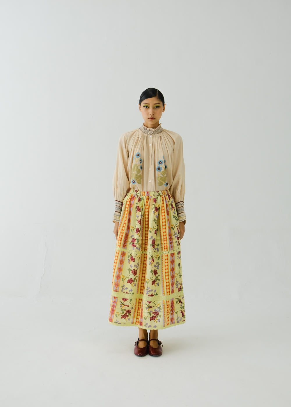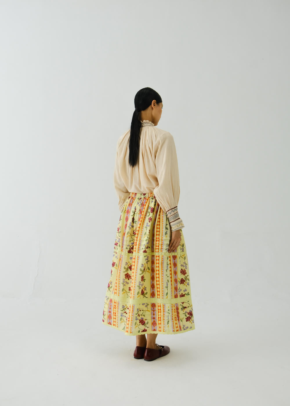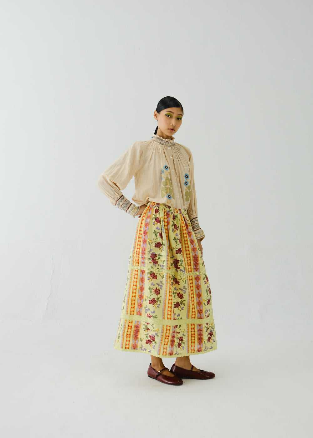 Elevate your style with the Emily Skirt, a gracefully flowing A-line silhouette complemented by a comfortable elasticated waistband, Folk Bloom print and lace inserts. Fabric : Linen