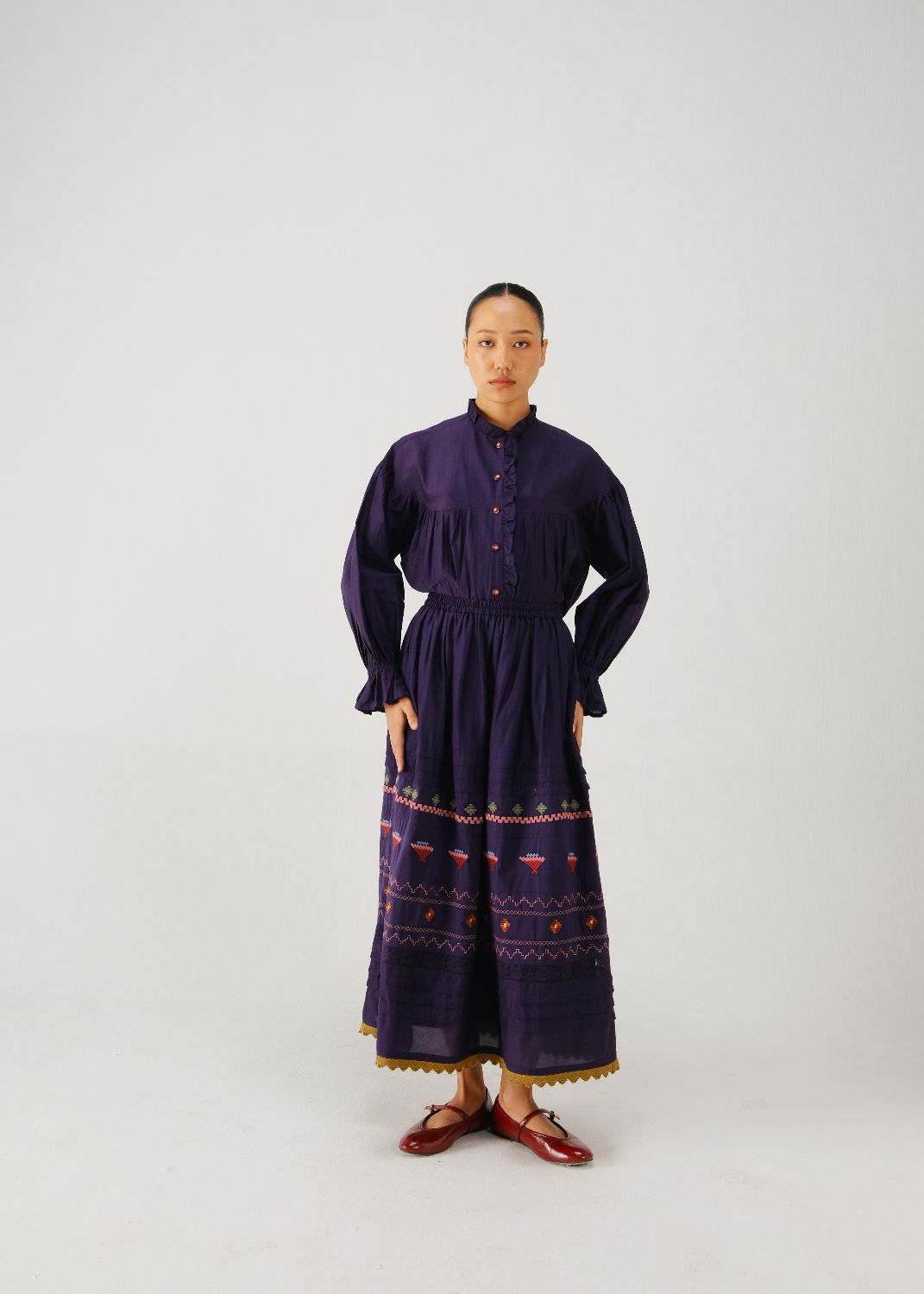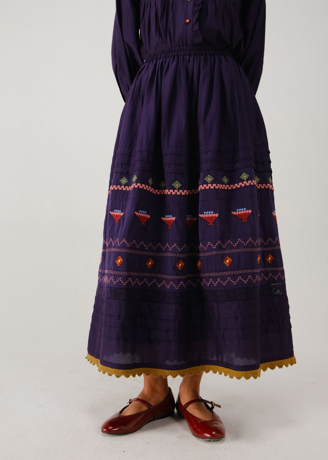 Elevate your style with the Emily Skirt, a gracefully flowing A-line silhouette, complemented by a comfortable elasticated waistband, intricate ink folk embroidery, and lace inserts.