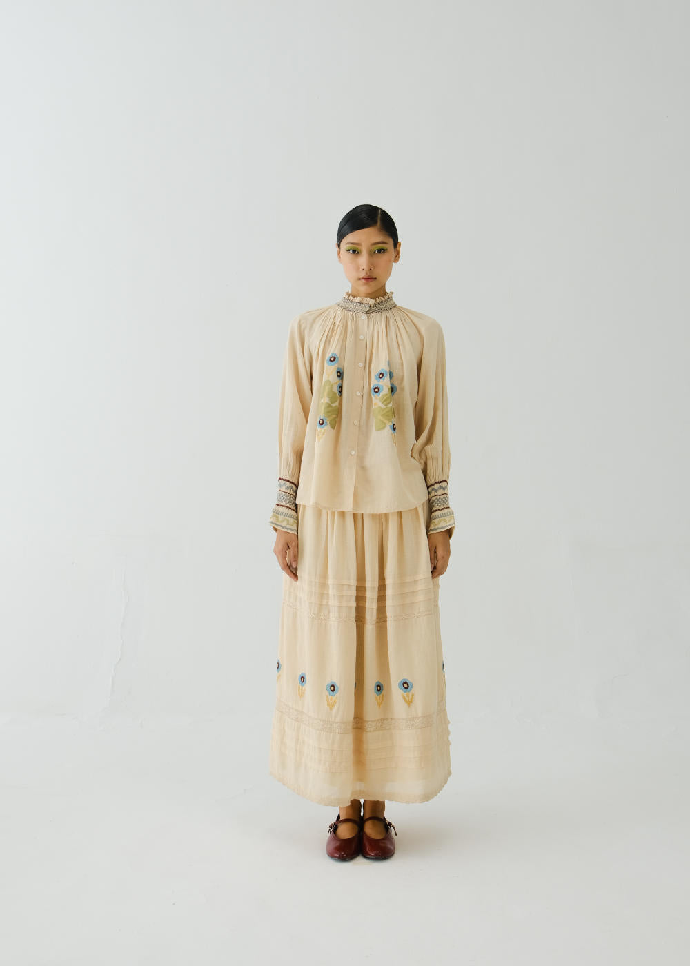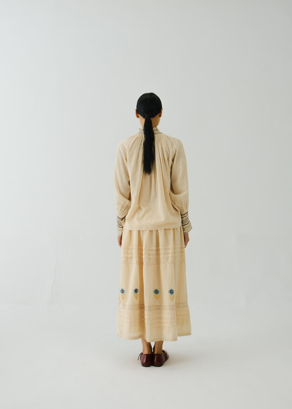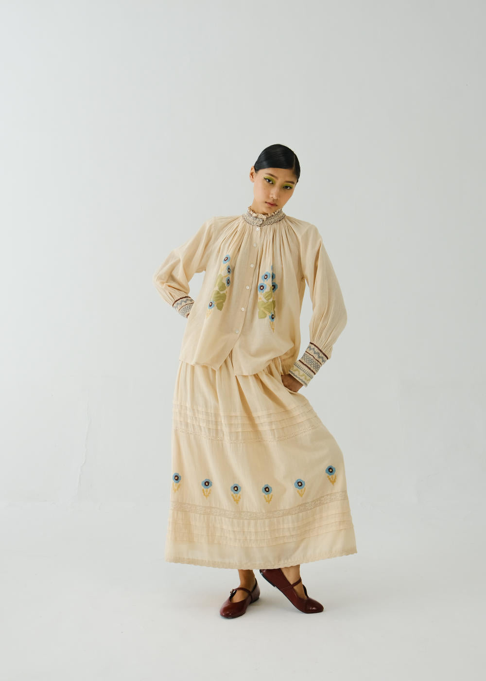 Elevate your style with the Emily Skirt, a gracefully flowing A-line silhouette complemented by a comfortable elasticated waistband, Ivory Pixel Applique print and lace inserts. Fabric : Linen