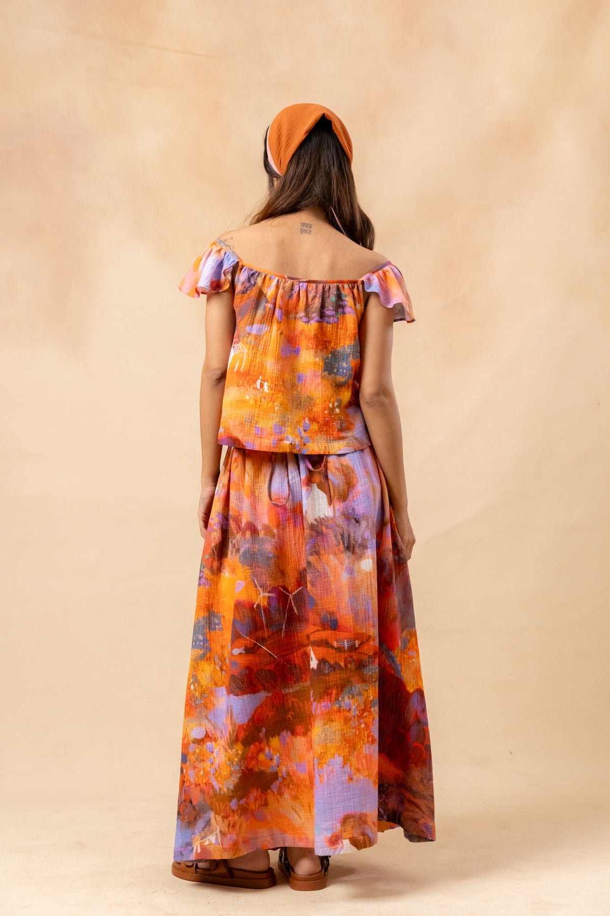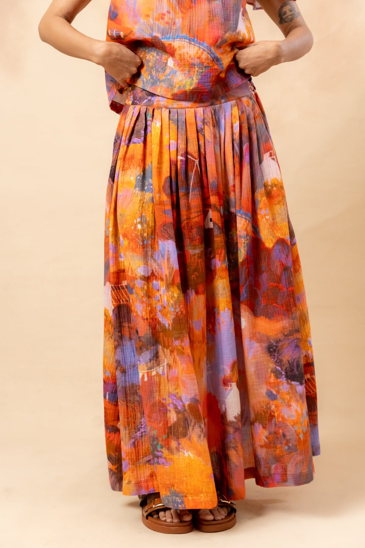 Description: This doodle printed skirt comes with front pleats, adjustable back with drawstrings and side pockets.