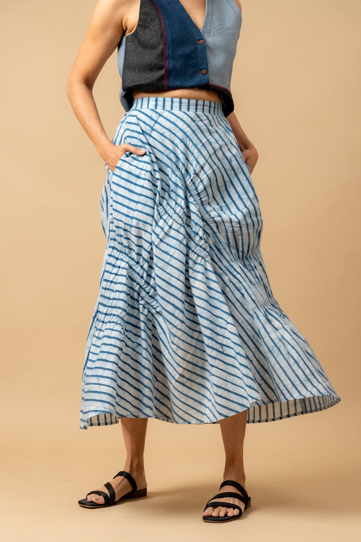 Description: Deconstructed skirt with gathers and back elastic with inseam side pockets.