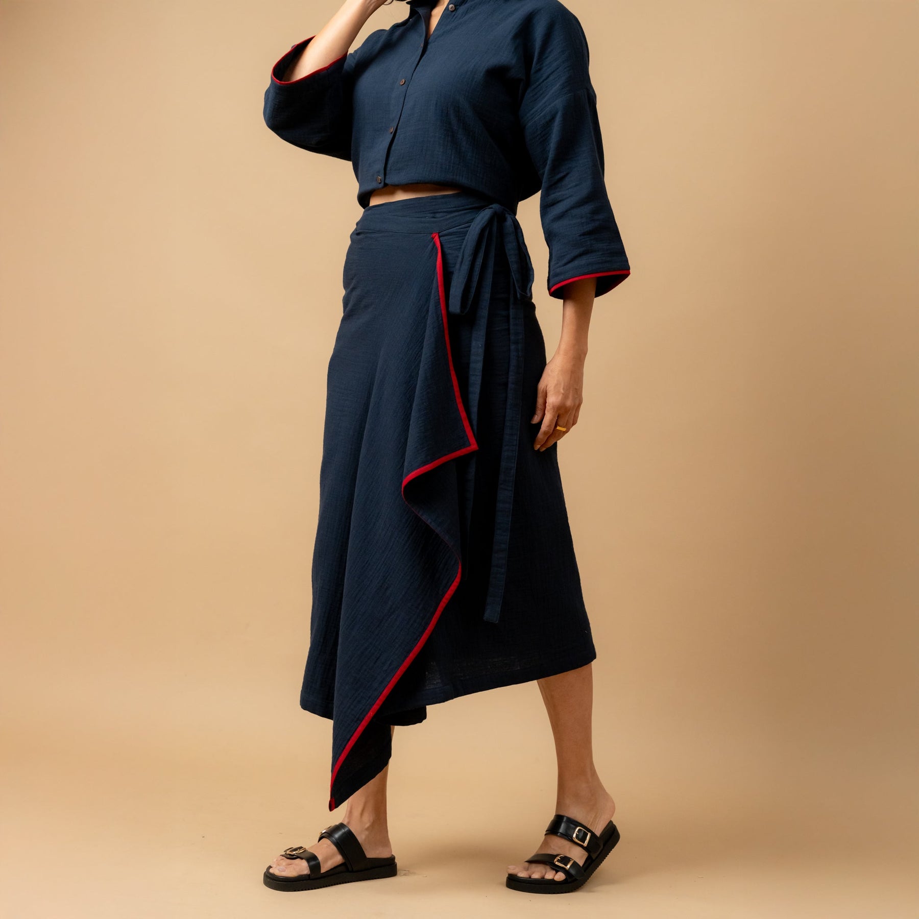 Description: Adjustable asymmetrical tie skirt with a side pocket.