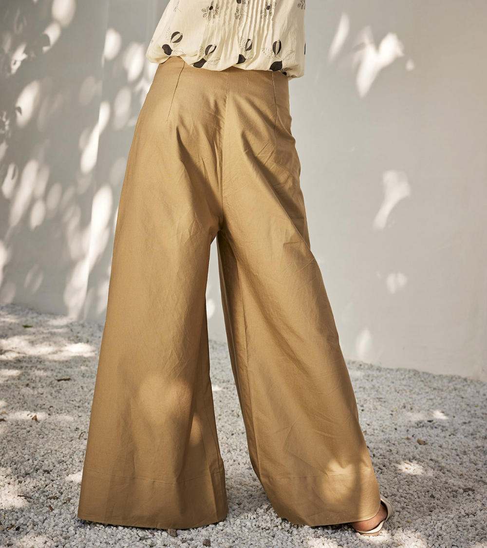 A khaki twill cotton flared pleated trouser with side seam pockets and front button opening.