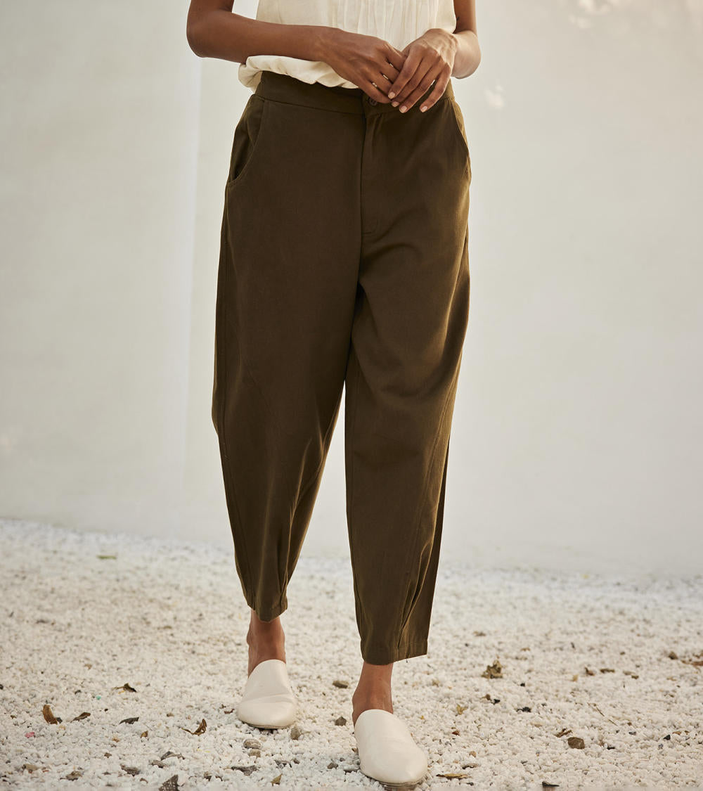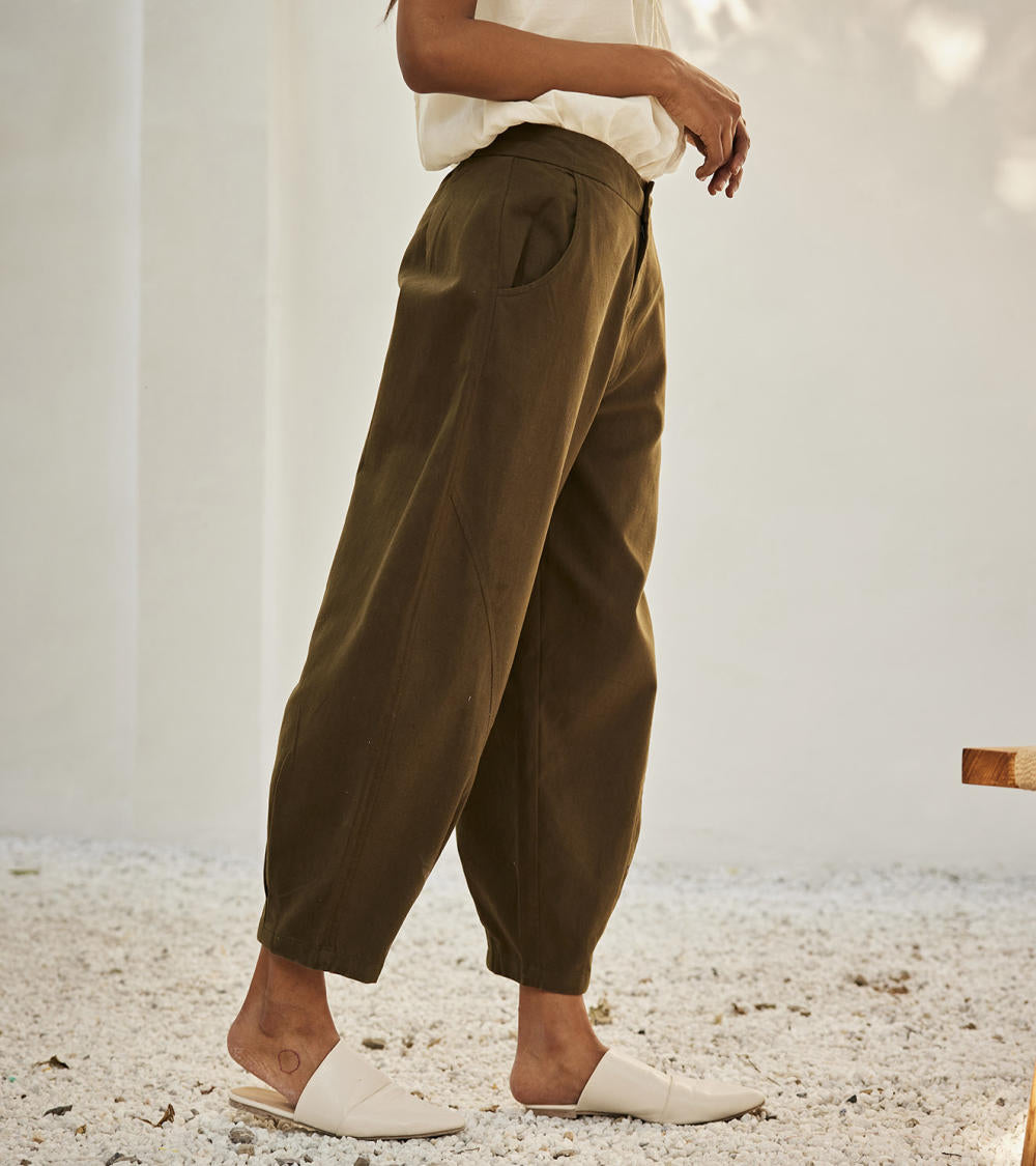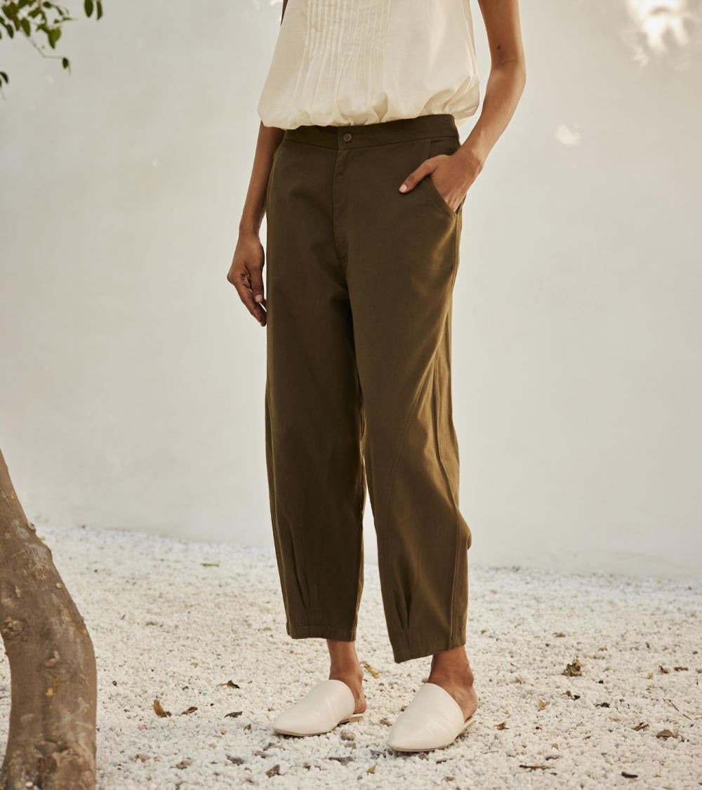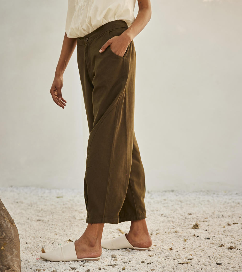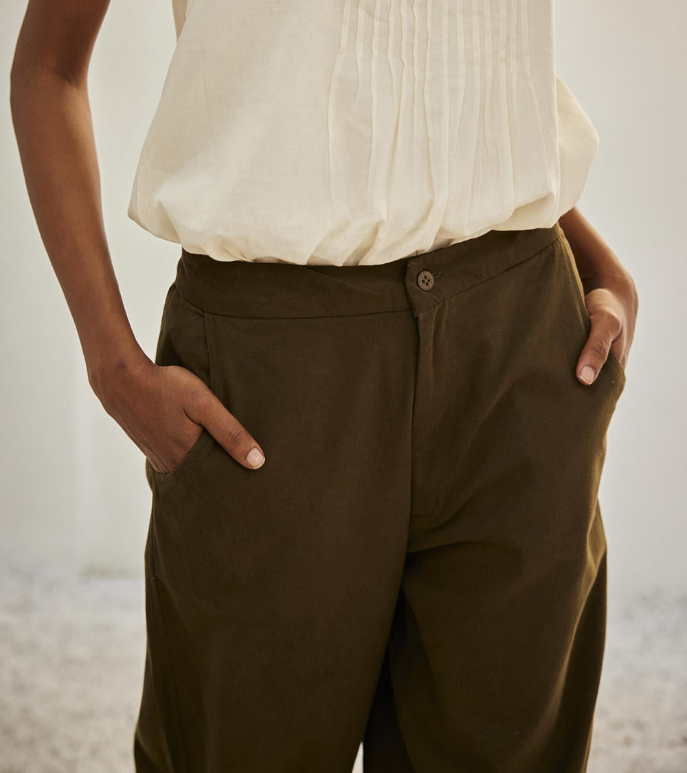 An olive green twill cotton with front button opening, side curve pockets, elasticated back and a pleated hem.
