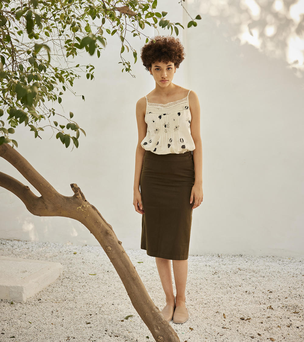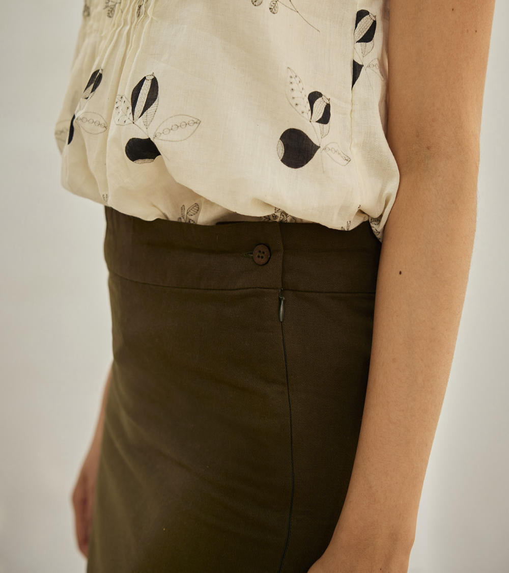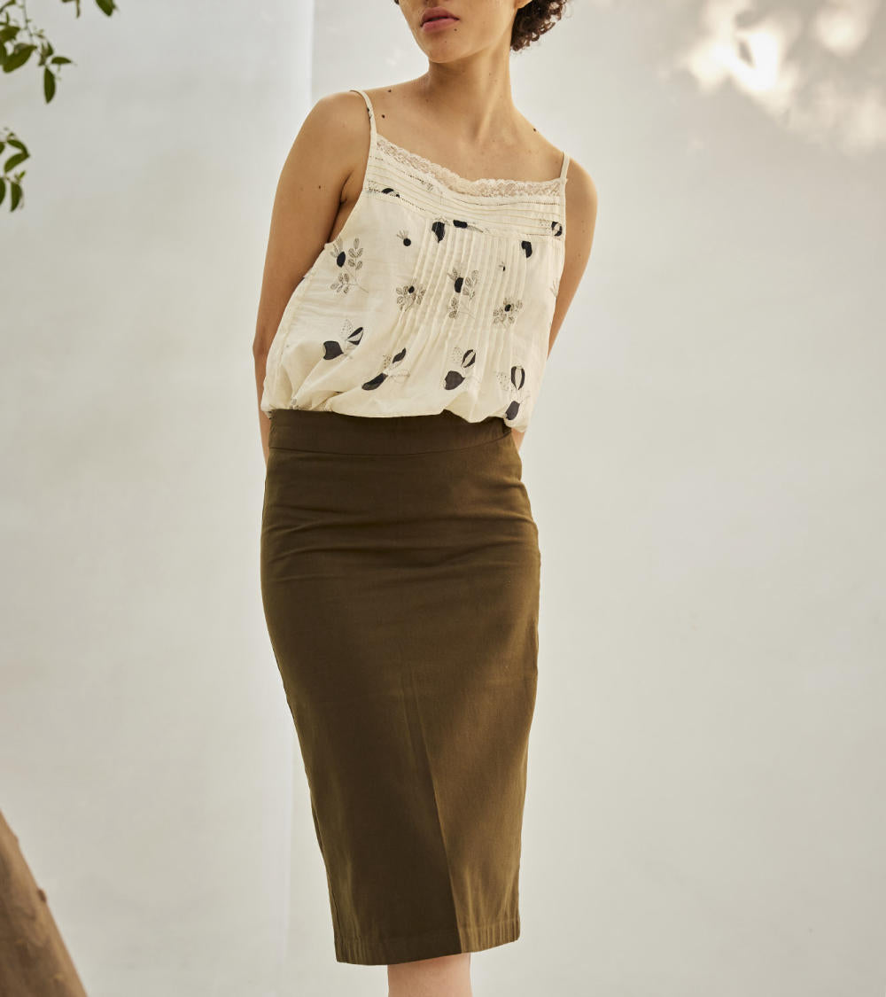 An olive green twill cotton skirt with a back slit, side invisible zipper and button opening.