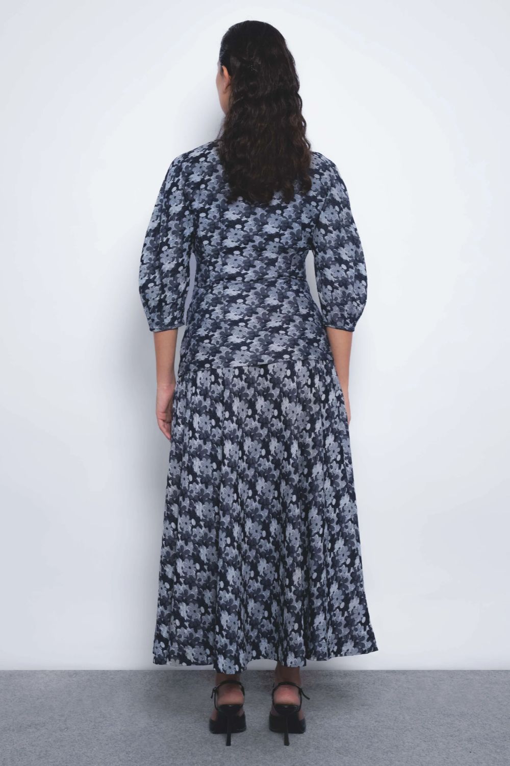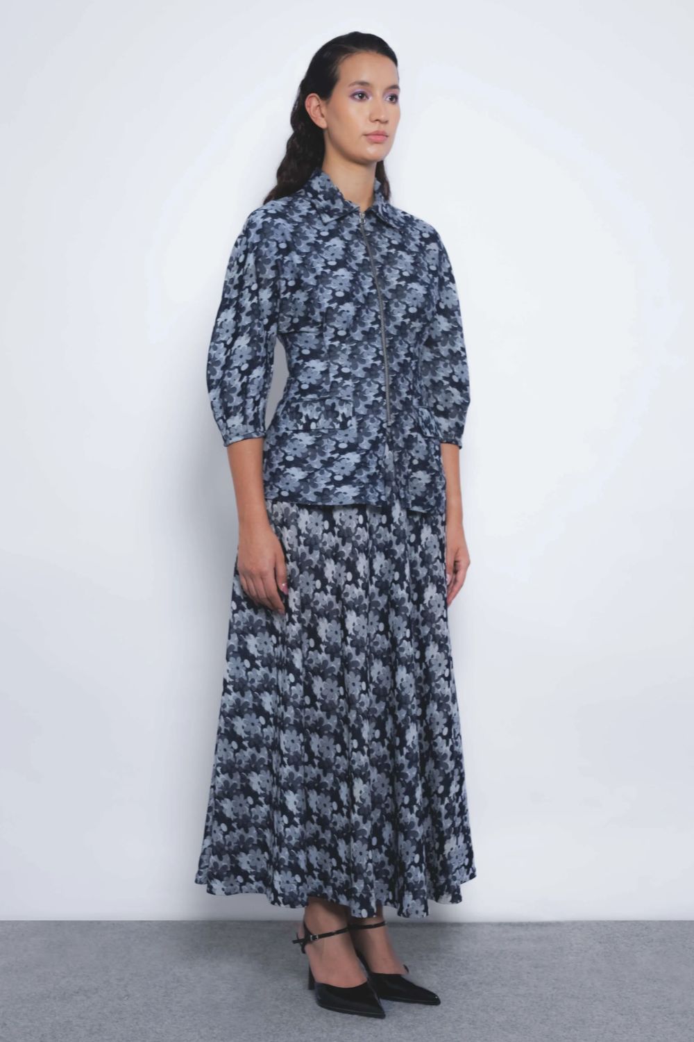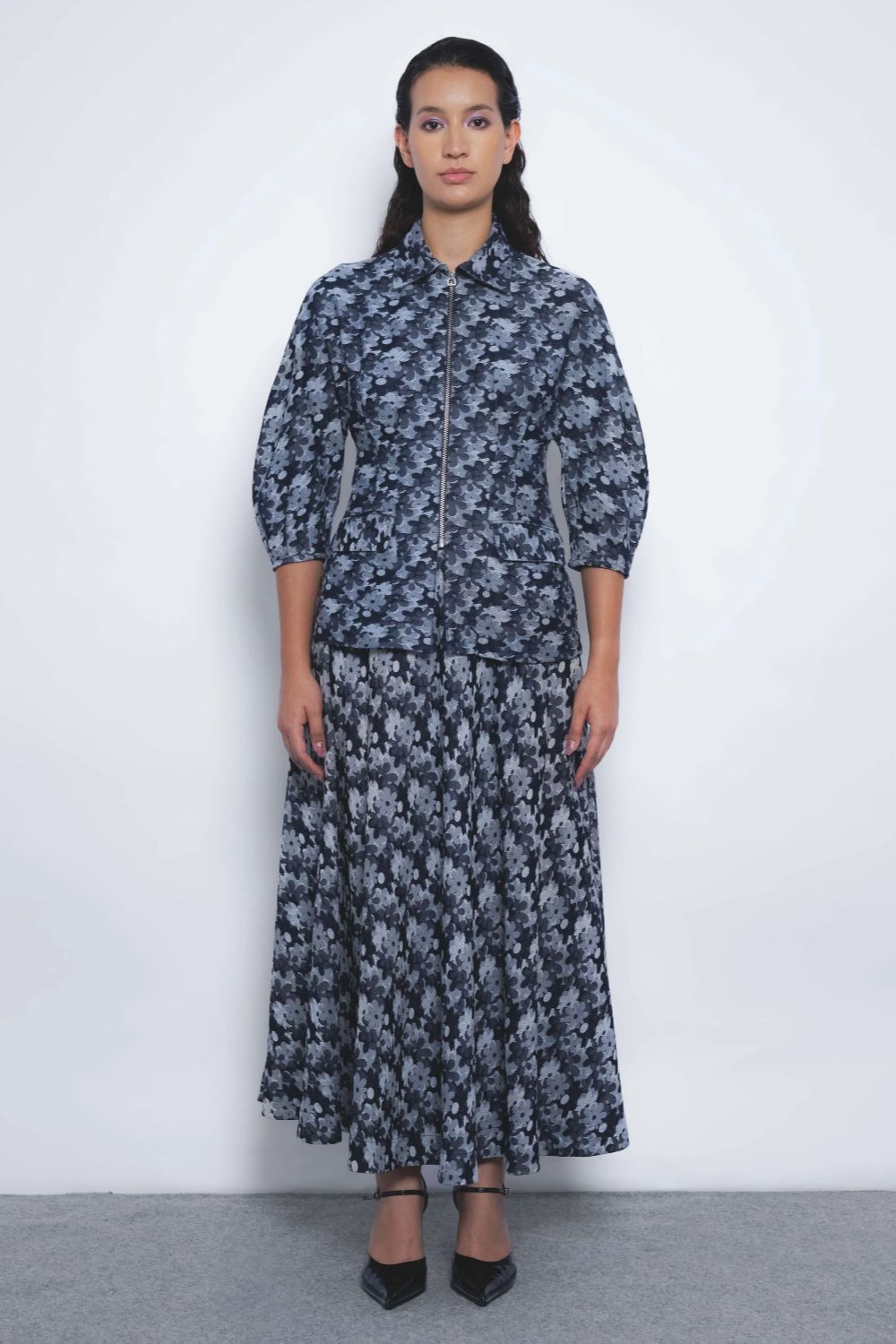 A classic flared A-line skirt, tailored in floral denim jacquard, introduces a playful sensibility to a timeless silhouette.