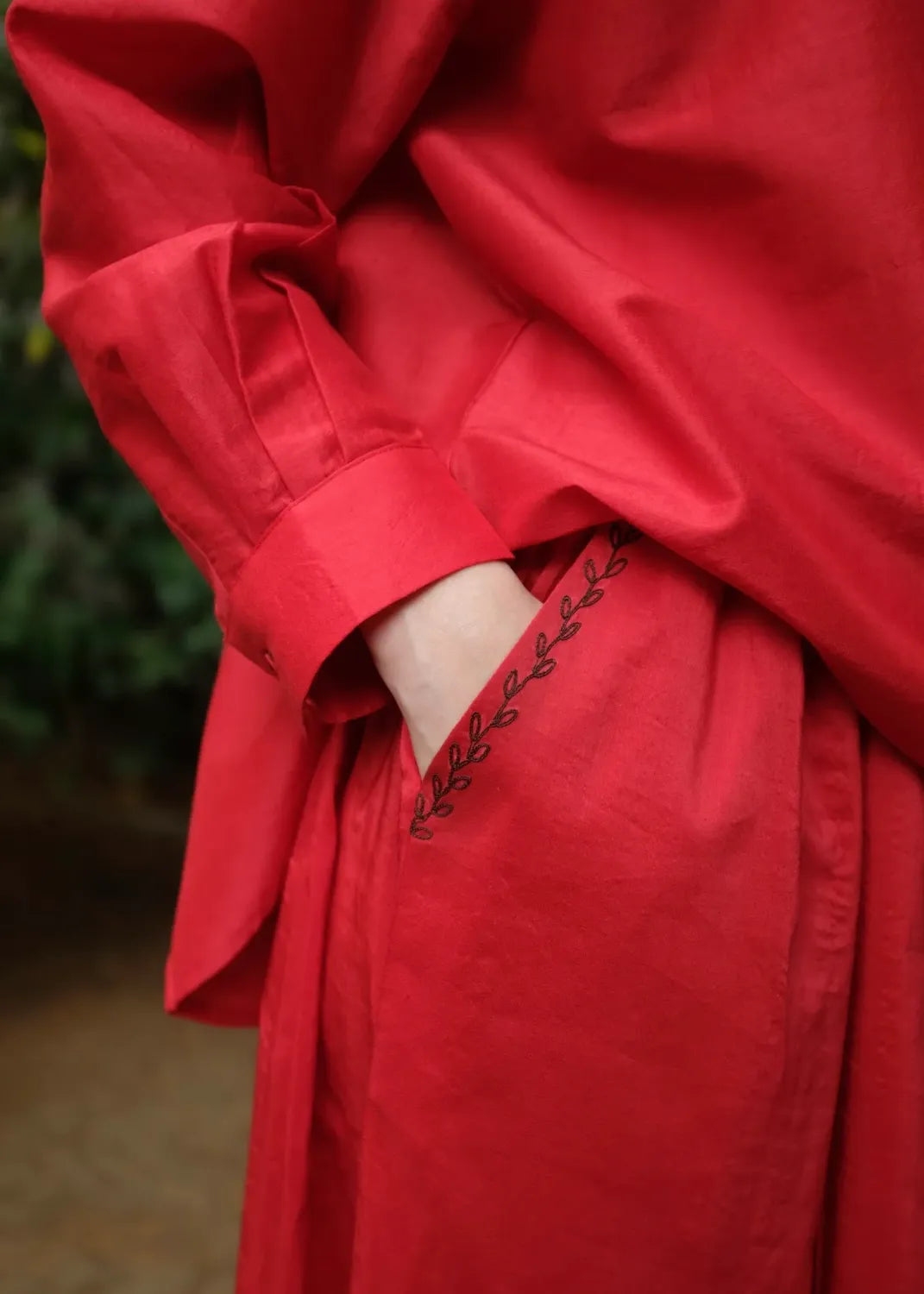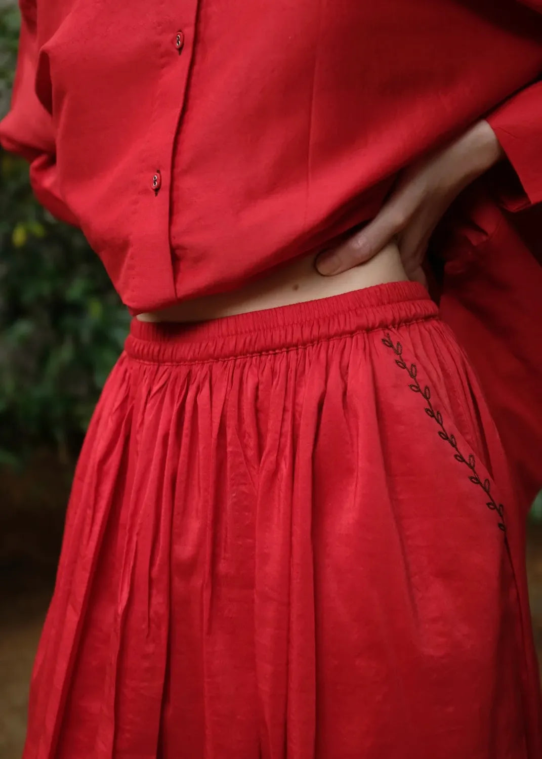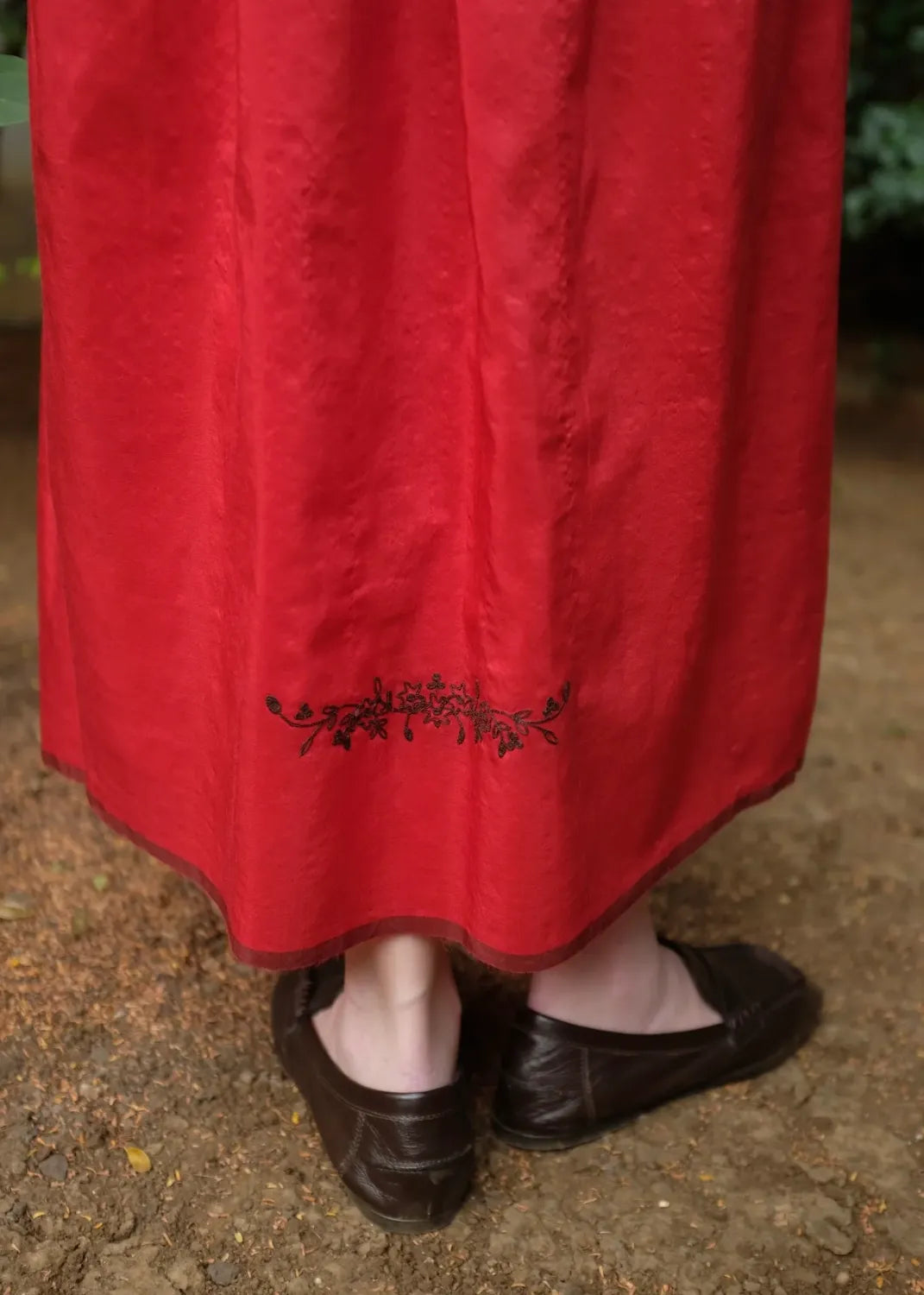A skirt cut from a blend of handwoven light - weight merino wool and mulberry silk, designed with a fully elasticated waist for effortless ease. Delicate floral embroidery appears at the pockets and the back, rendered in contrasting hues that add a quiet layer of detail. Soft structure and subtle ornamentation come together in a piece that feels both comfortable and considered.