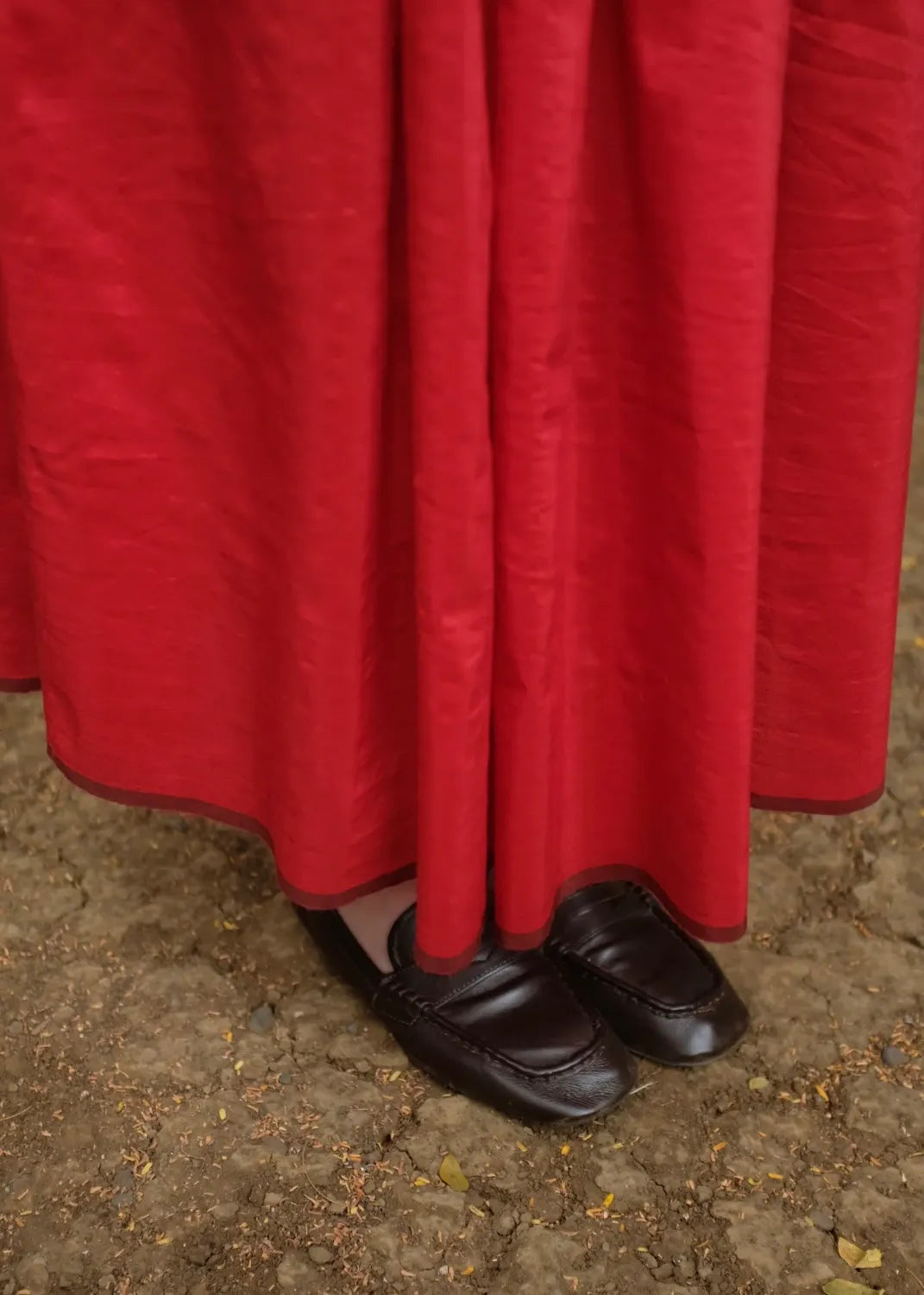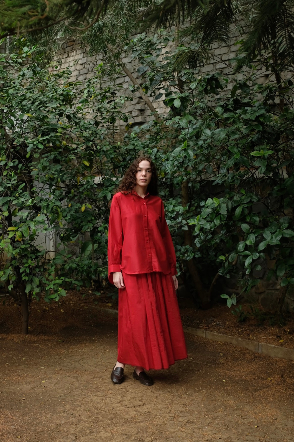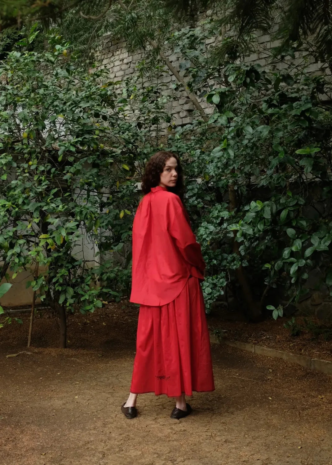 A skirt cut from a blend of handwoven light - weight merino wool and mulberry silk, designed with a fully elasticated waist for effortless ease. Delicate floral embroidery appears at the pockets and the back, rendered in contrasting hues that add a quiet layer of detail. Soft structure and subtle ornamentation come together in a piece that feels both comfortable and considered.