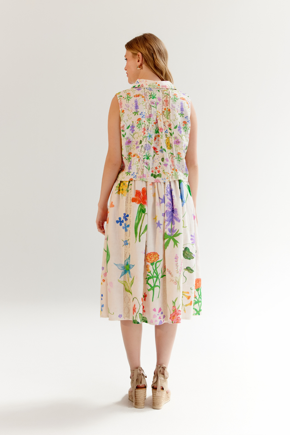 Introducing the Freya Set that is a perfect blend of elegance and versatility. This shirt-and-skirt set comes in three stunning variations: Landscape and Flora, both featuring vertical lace inserts and vibrant placement prints on breathable linen lyocell, and a classic Schiffli Embroidery design on soft viscose linen. Each sleeveless shirt is thoughtfully designed with criss-cross dori detailing at the front, adding a playful yet refined touch.