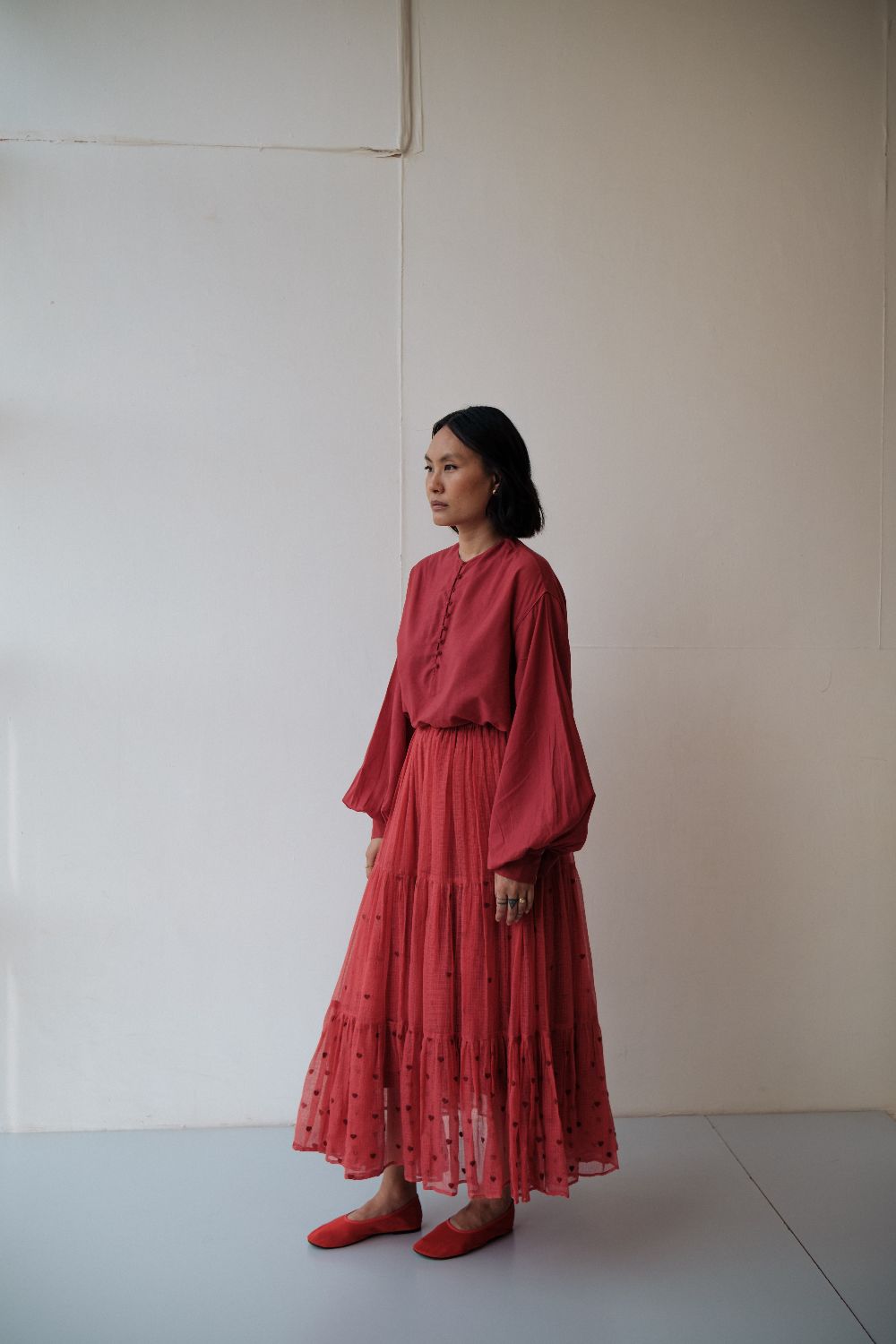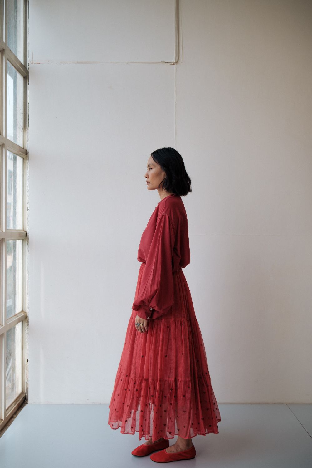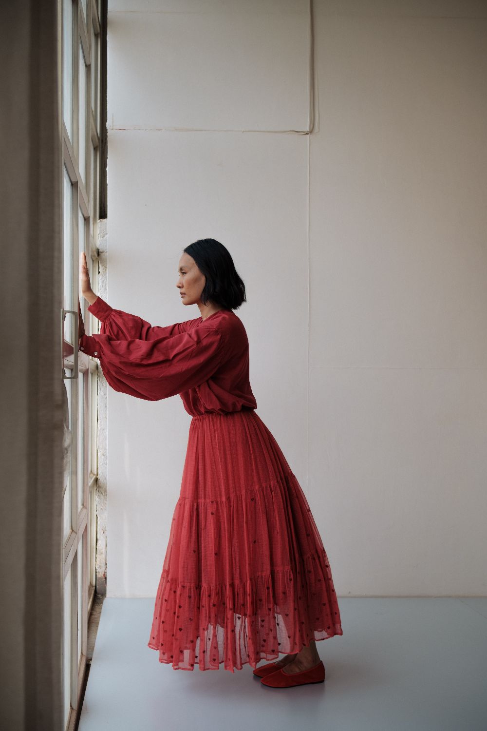 The silhouettes are simple but considered: relaxed cuts, thoughtful details, and fabrics that breathe — from handwoven cottons to delicately finished textiles rooted in Rajasthan’s craft culture. Colours stay close to the earth: muted florals, soft neutrals, and tones that age gracefully rather than fall out of season.