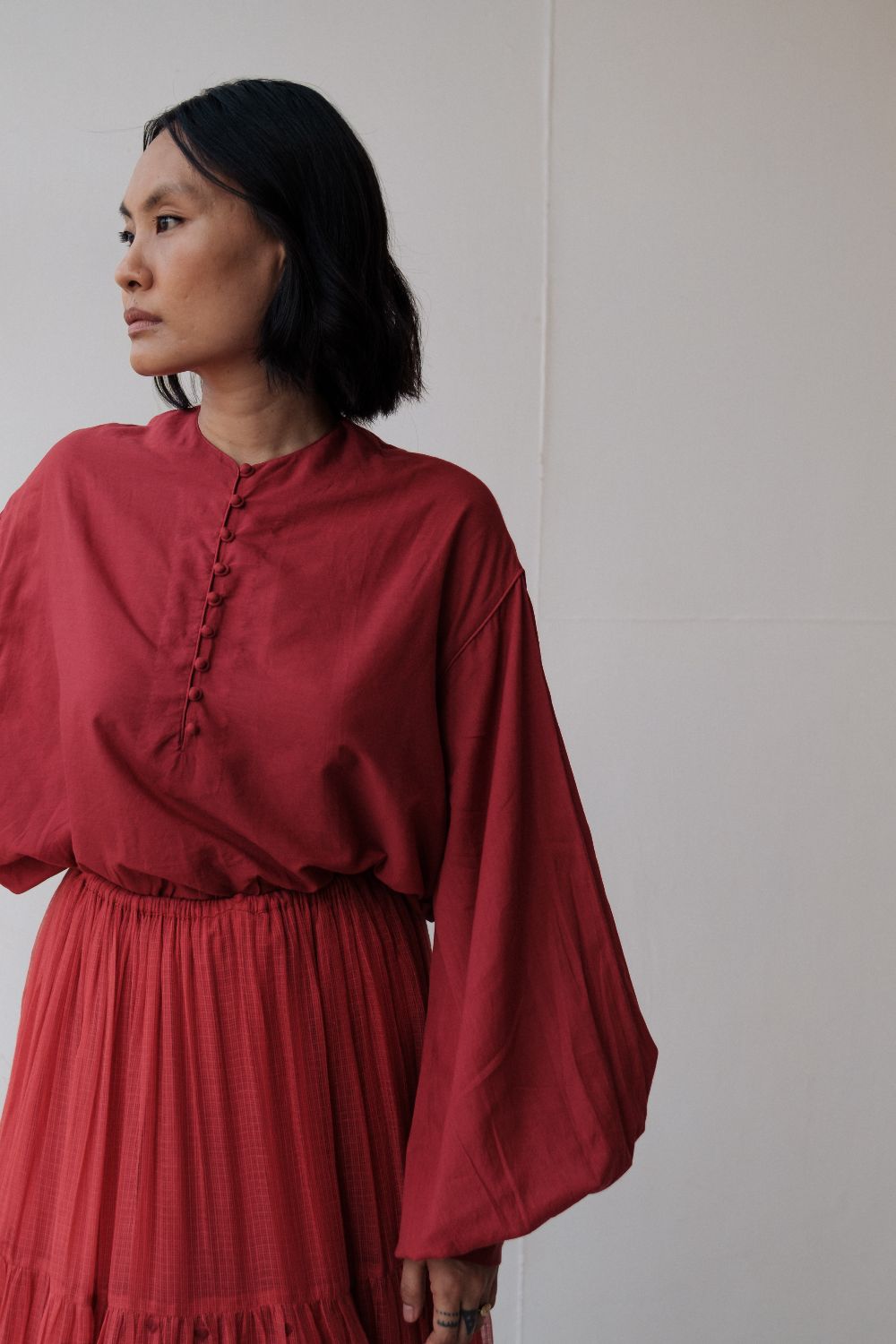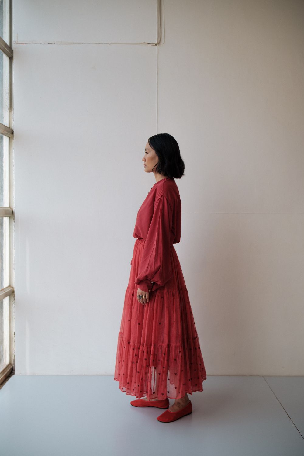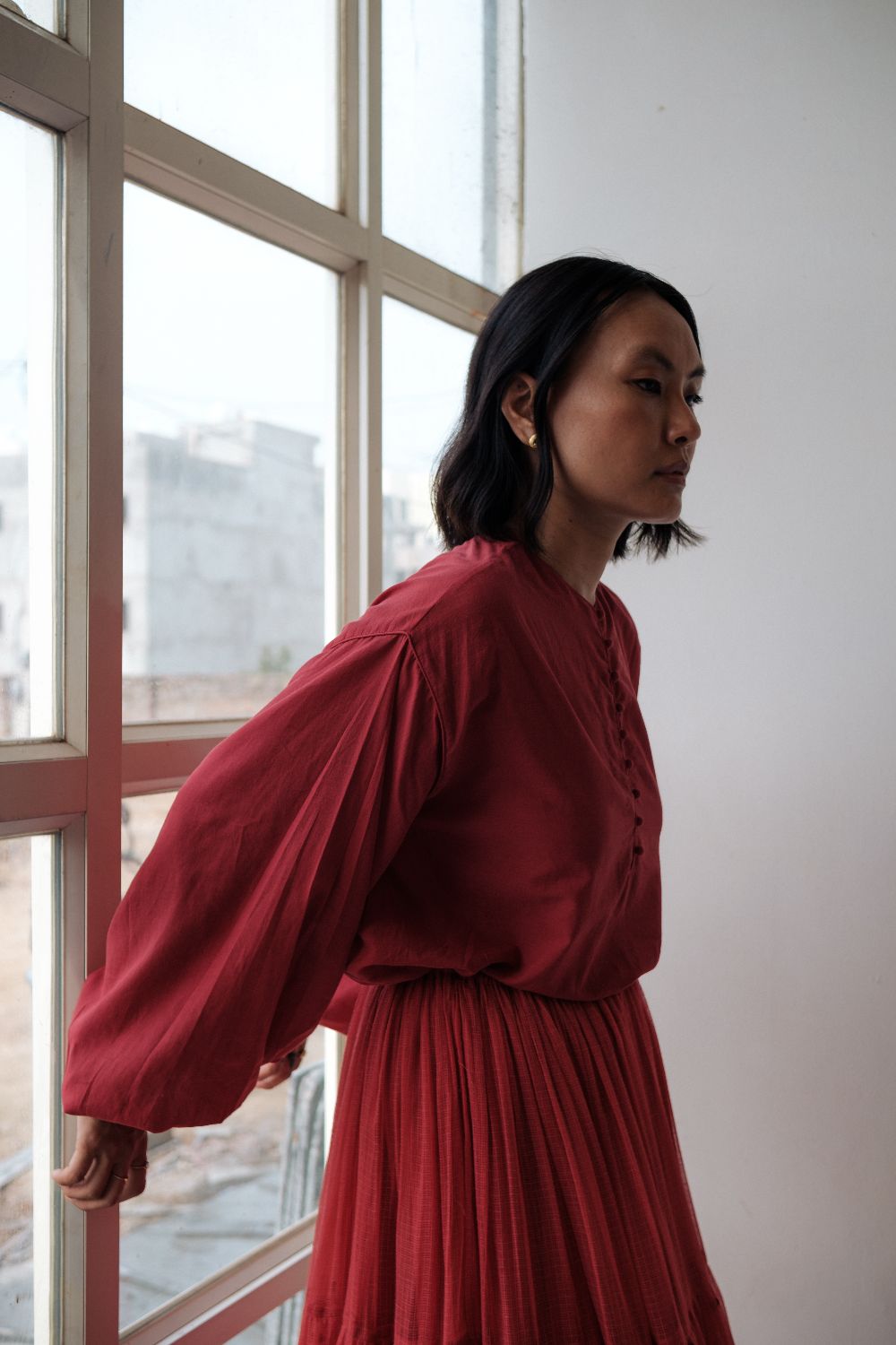 The silhouettes are simple but considered: relaxed cuts, thoughtful details, and fabrics that breathe — from handwoven cottons to delicately finished textiles rooted in Rajasthan’s craft culture. Colours stay close to the earth: muted florals, soft neutrals, and tones that age gracefully rather than fall out of season.