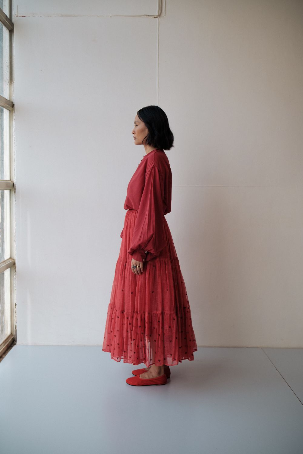 A skirt in handwoven kota doria fabric . The skirt has been hand embroidered by our in house artisans .with a cotton lining .