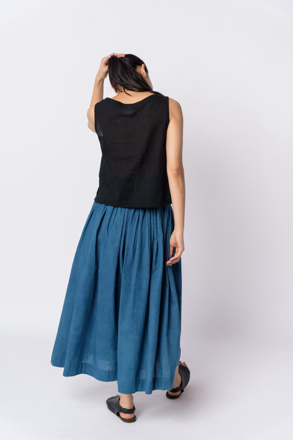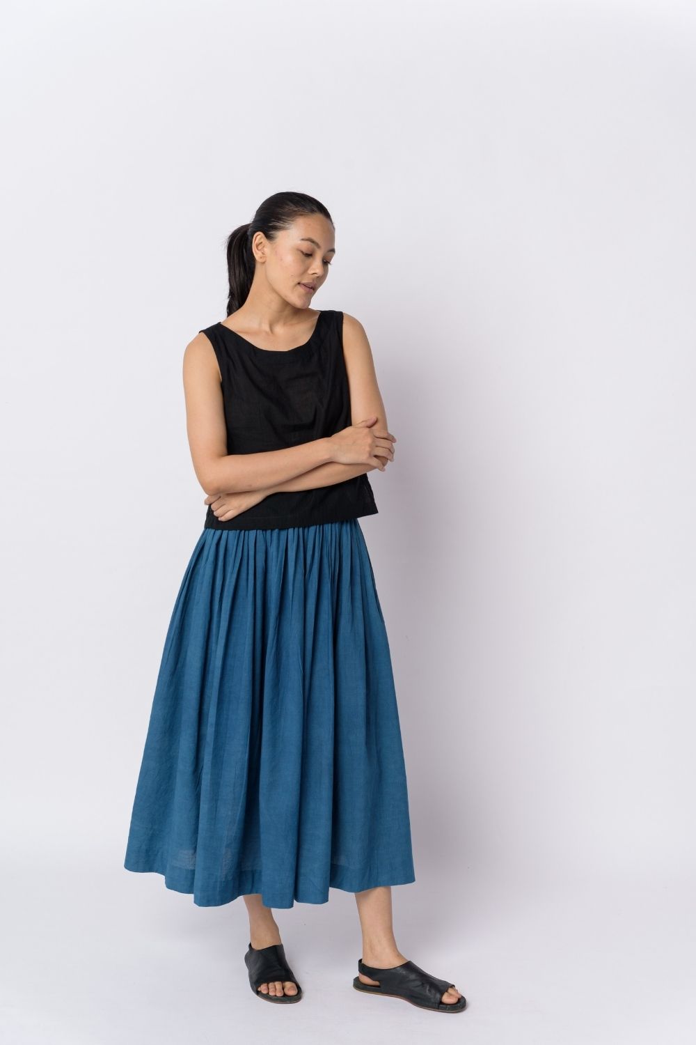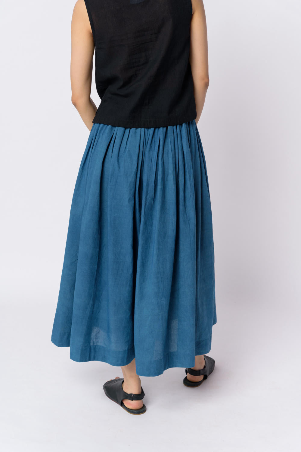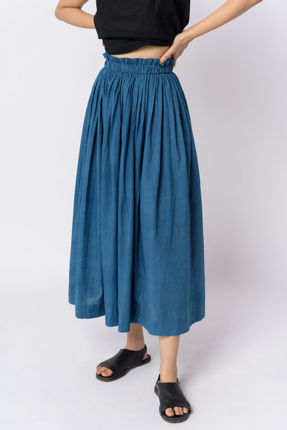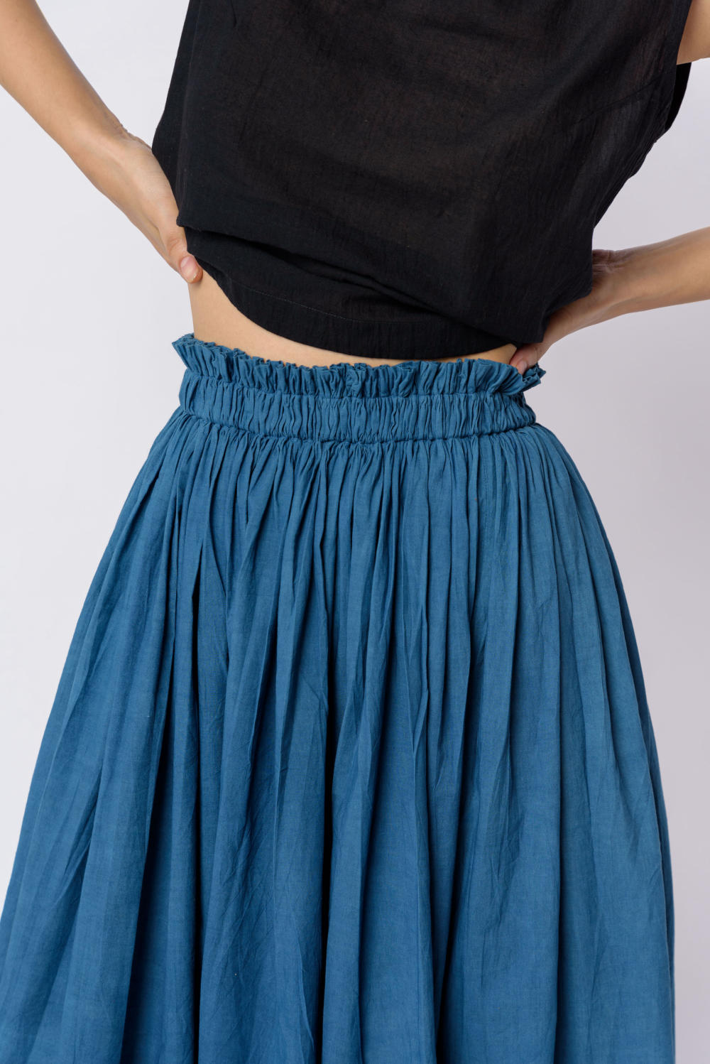 The indigo pleated skirt is cut from soft, breathable cotton that brings beautiful texture to this flared piece. It has an elasticated waist for maximum comfort, smocking details, and minimal ruffles at the waistline. Its flowy hem falls at the mid-calf line. Style it with basic t-shirts or strappy tops for ease and enhancement.