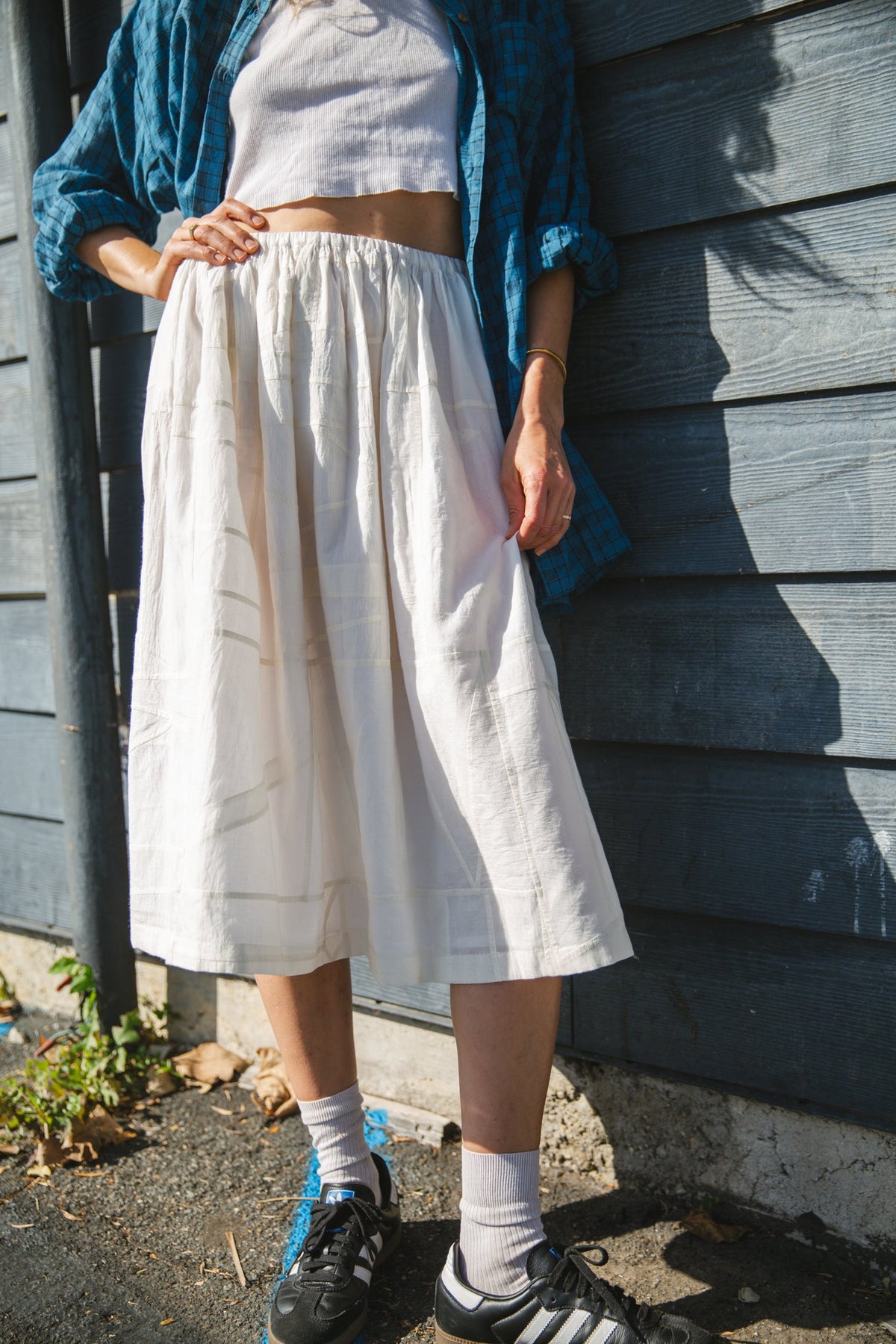Light, airy, and effortlessly elegant, the Silver Lake Skirt is crafted from handwoven cotton, bringing a touch of quiet luxury to your everyday wardrobe. The soft gathers and relaxed silhouette create a fluid, comfortable fit, while subtle geometric patchwork add an artisanal charm. Finished with an elasticated waistband, this skirt is perfect for breezy city strolls or slow afternoons by the coast.