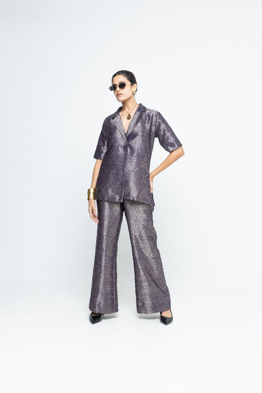 Gold Purple Statement Raw Silk geometric patterned handwoven Wrap detail metallic blazer set