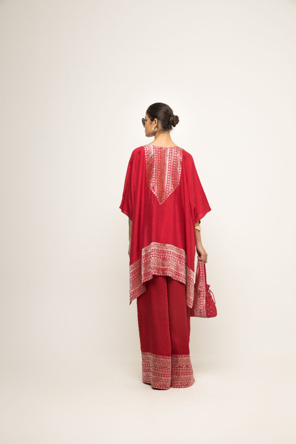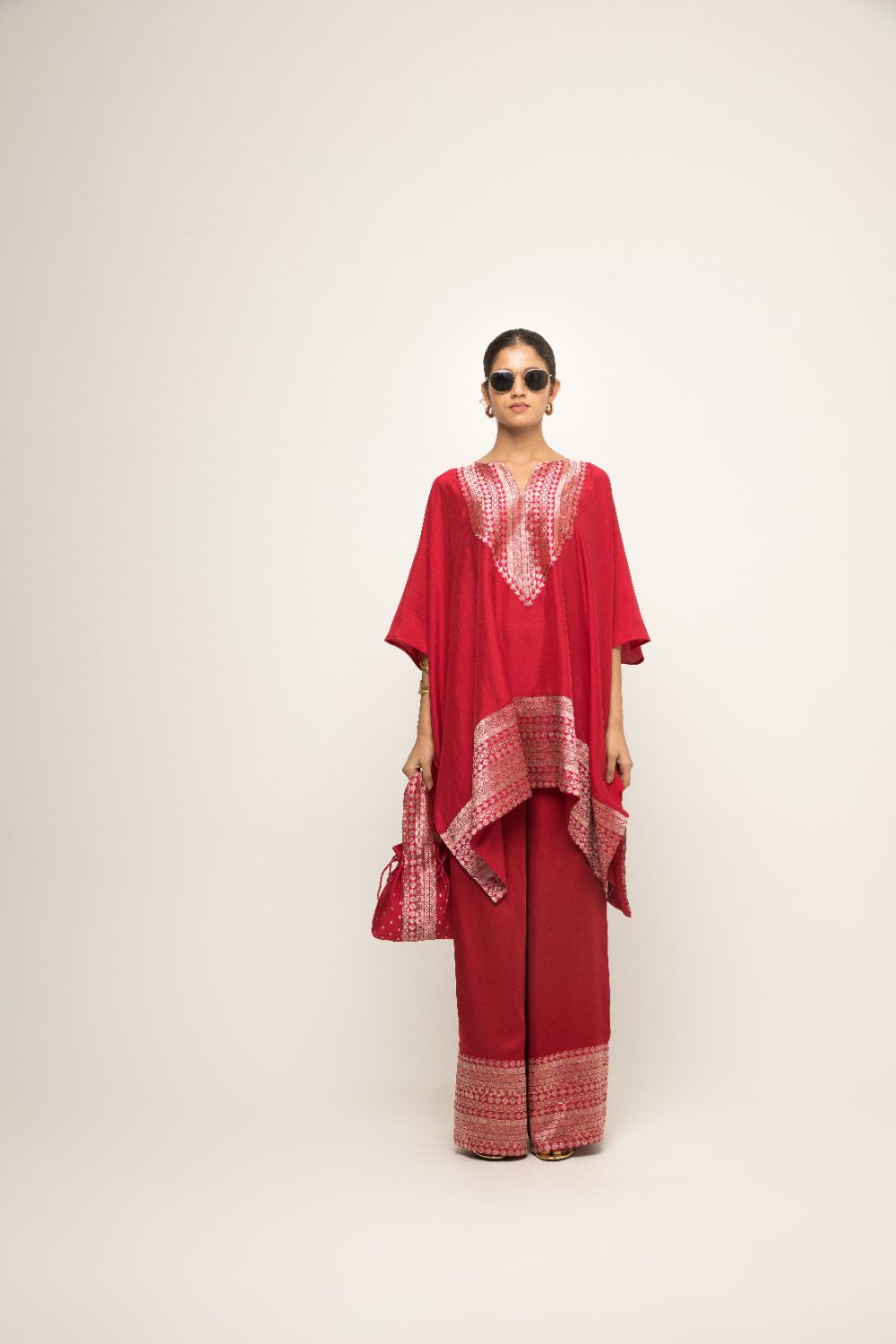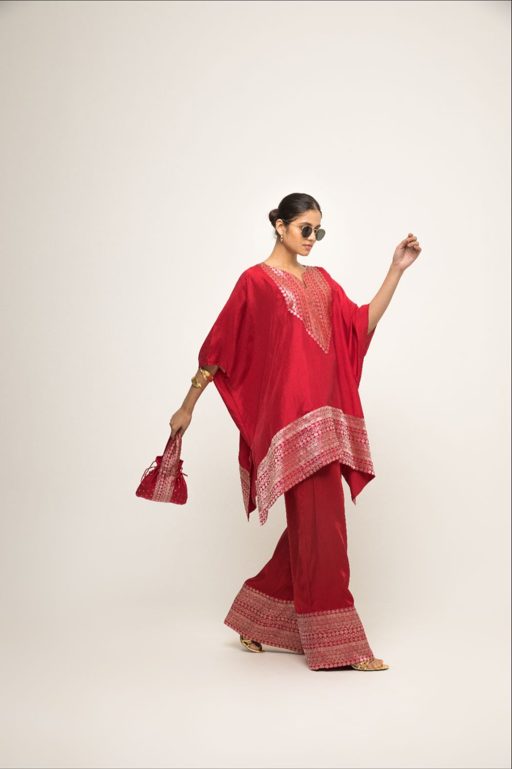 Red Pure silk asymmetrical kurta with woven Brocade border details on neck and bottom paired with matching pants