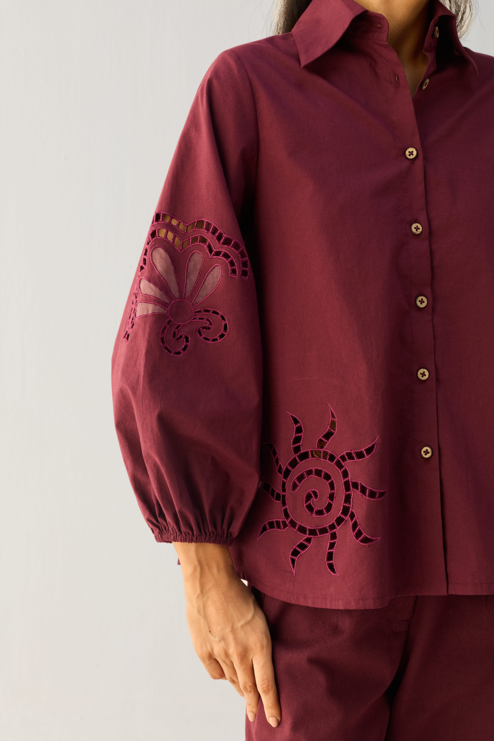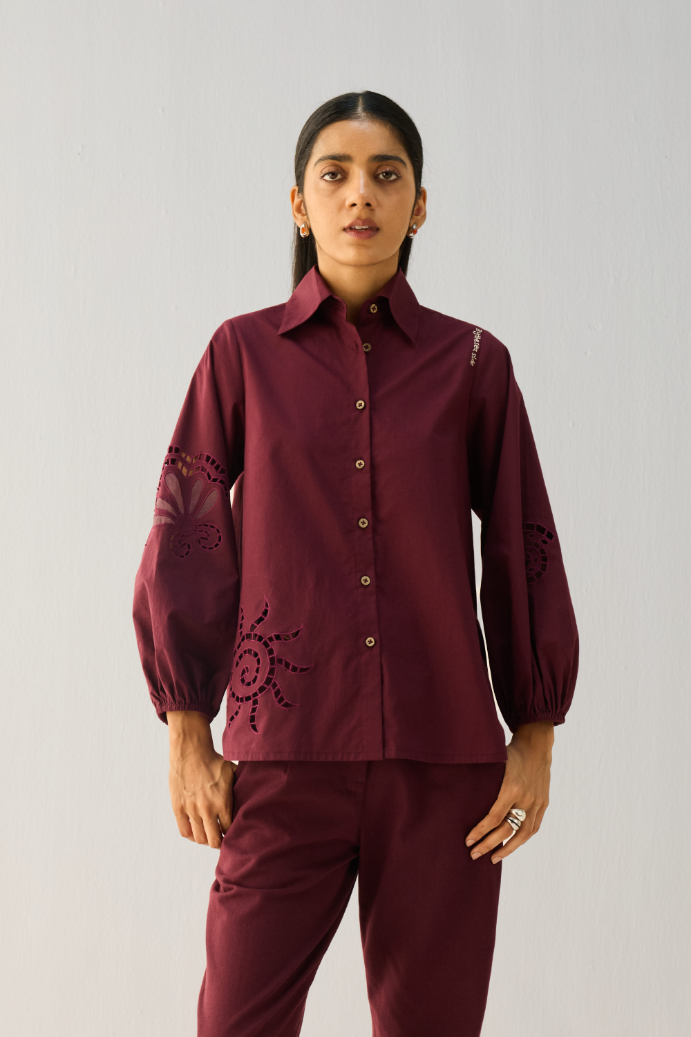 Regular fit, long puff sleeve, collared, classic shirt that buttons at the front, crafted in azo-free dyed organic cotton poplin fabric, hand and machine embroidered with nature-inspired, sun and quote motfis.