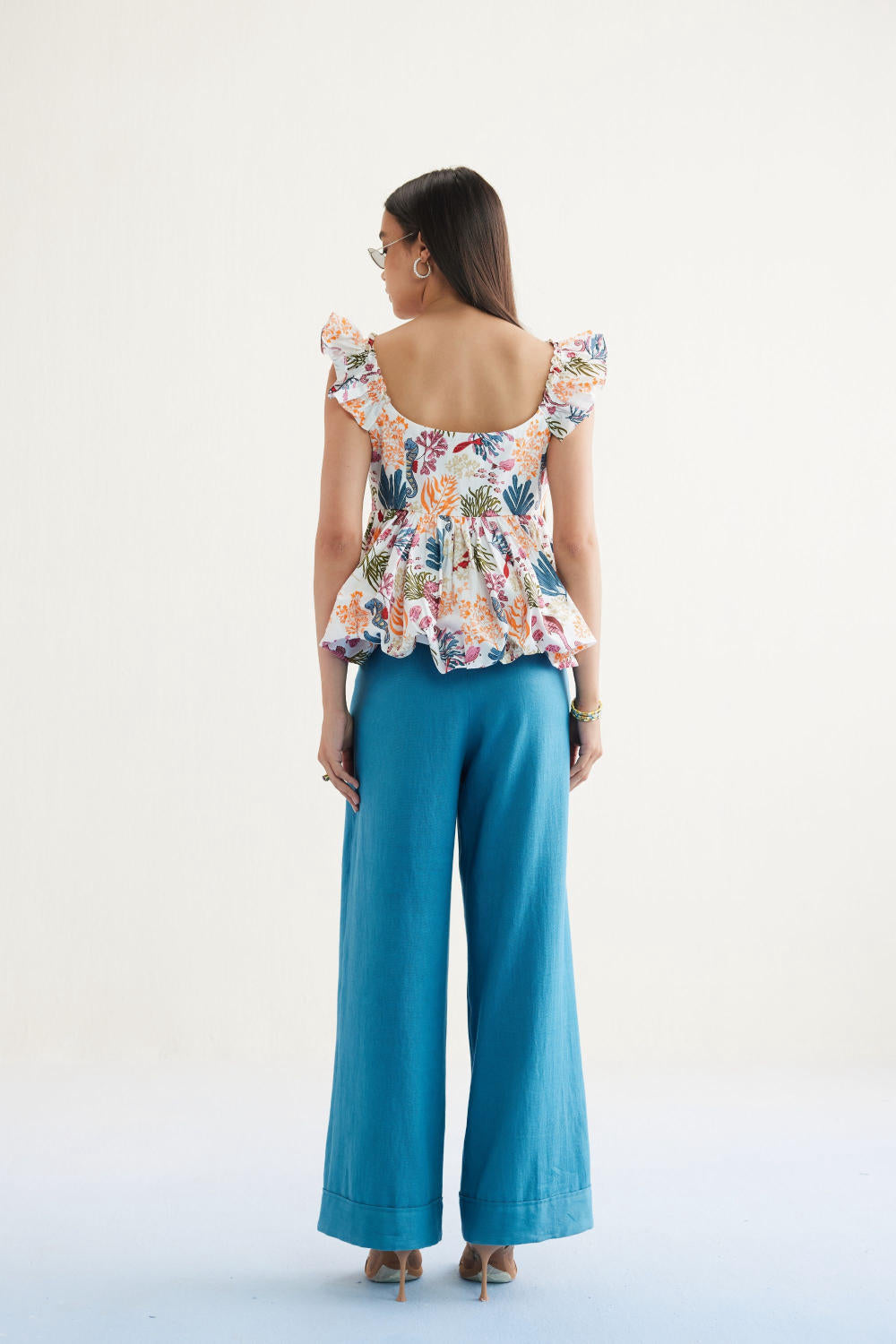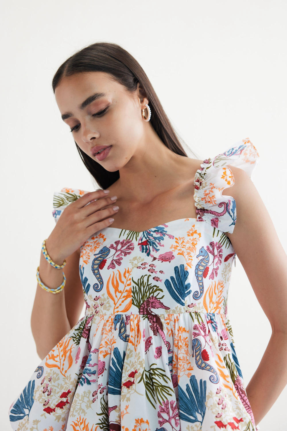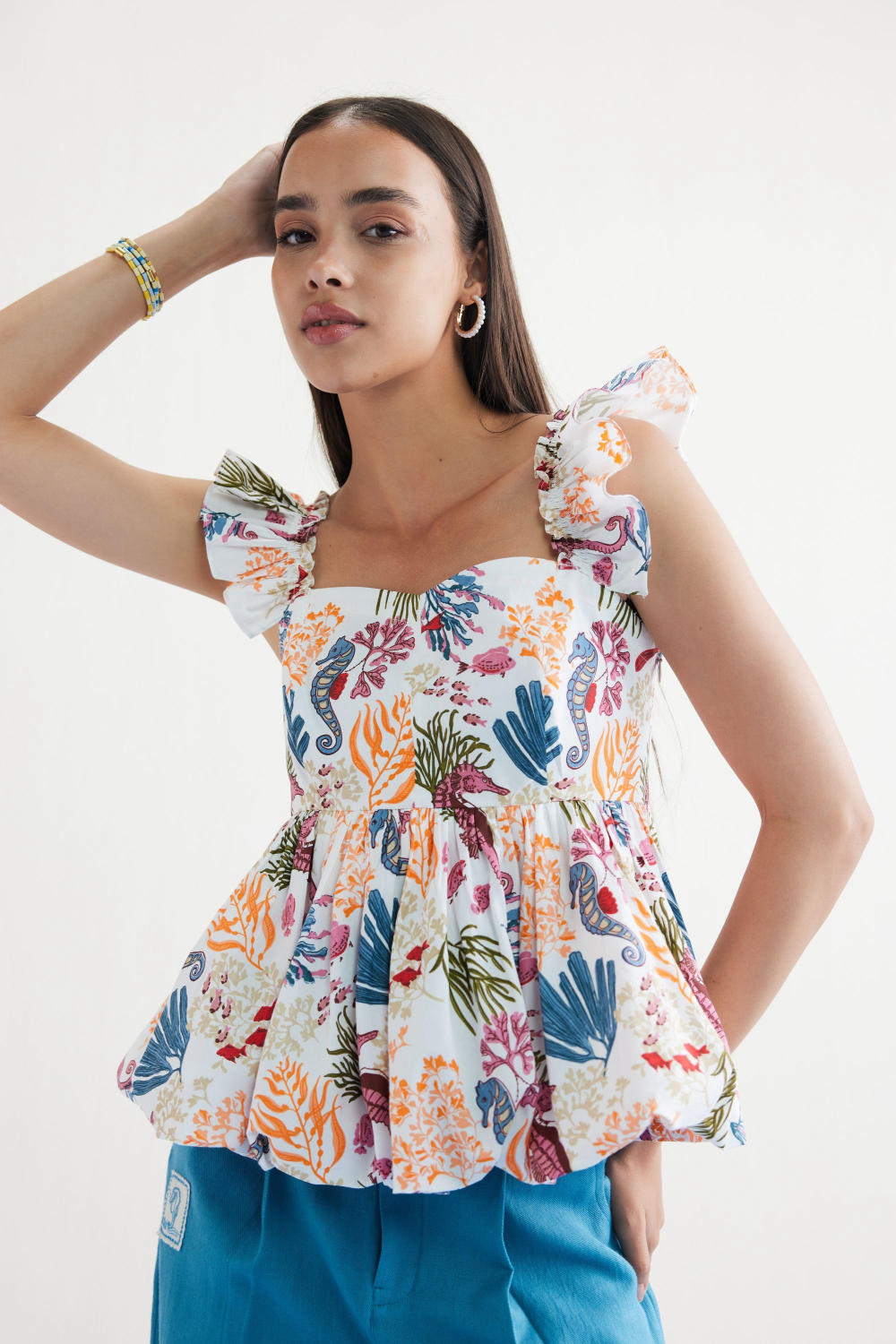 Fitted, short frill sleeve, peplum top with a sweetheart neckline, crafted in organic cotton poplin fabric, screen printed with our signature ocean life inspired motif using azo-free dyes.