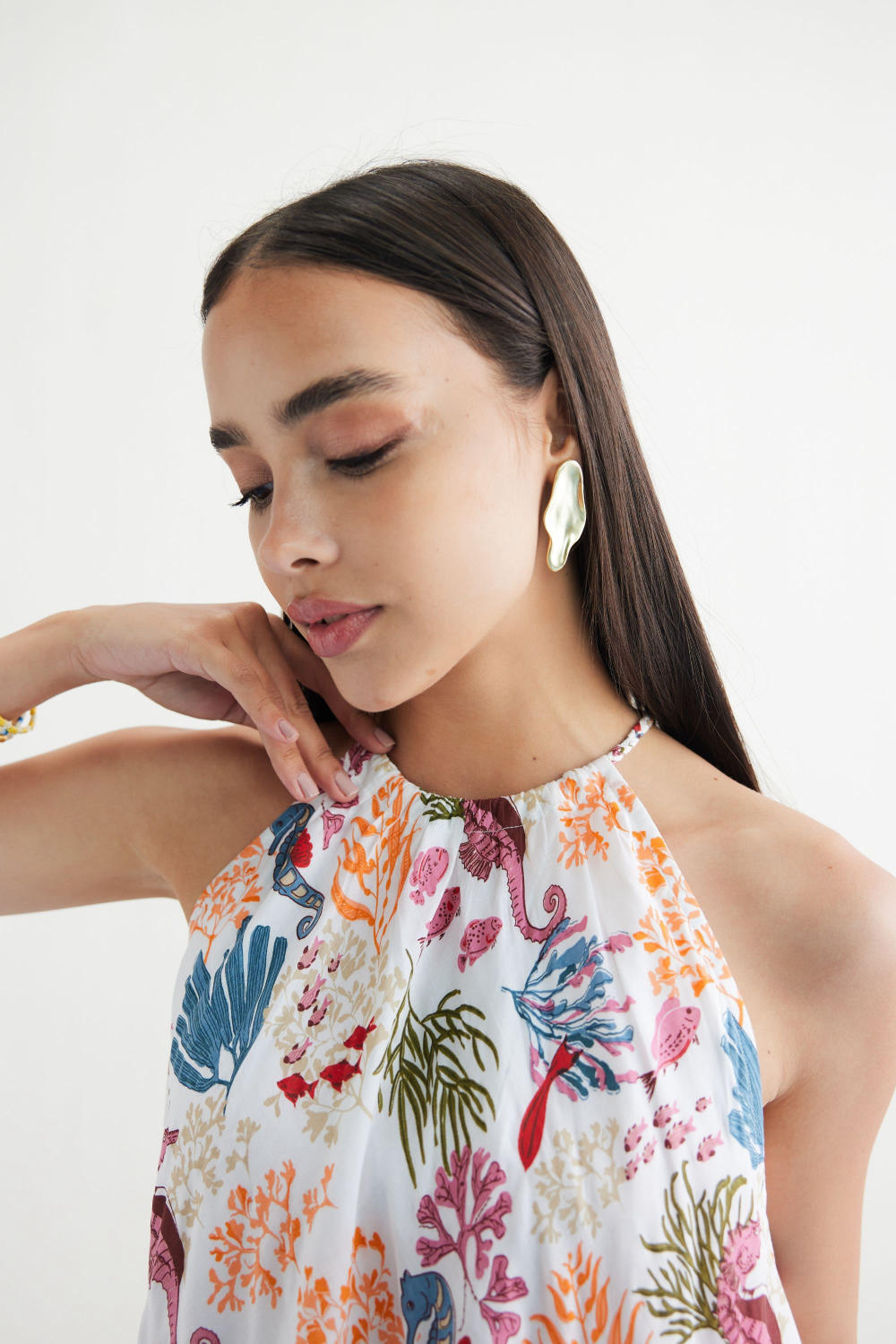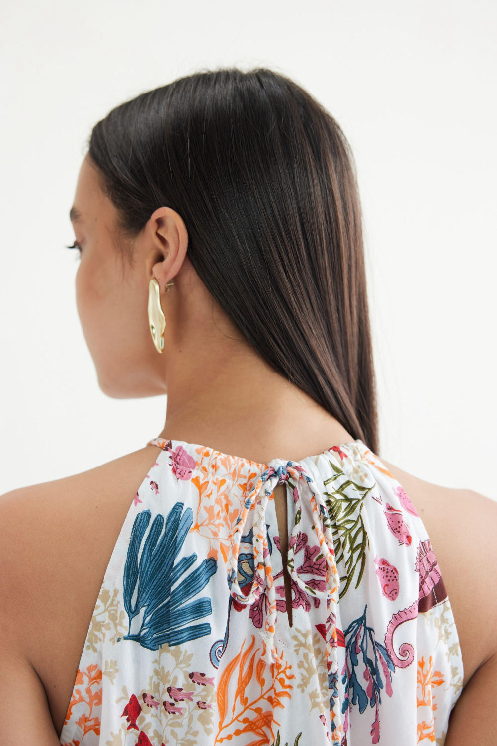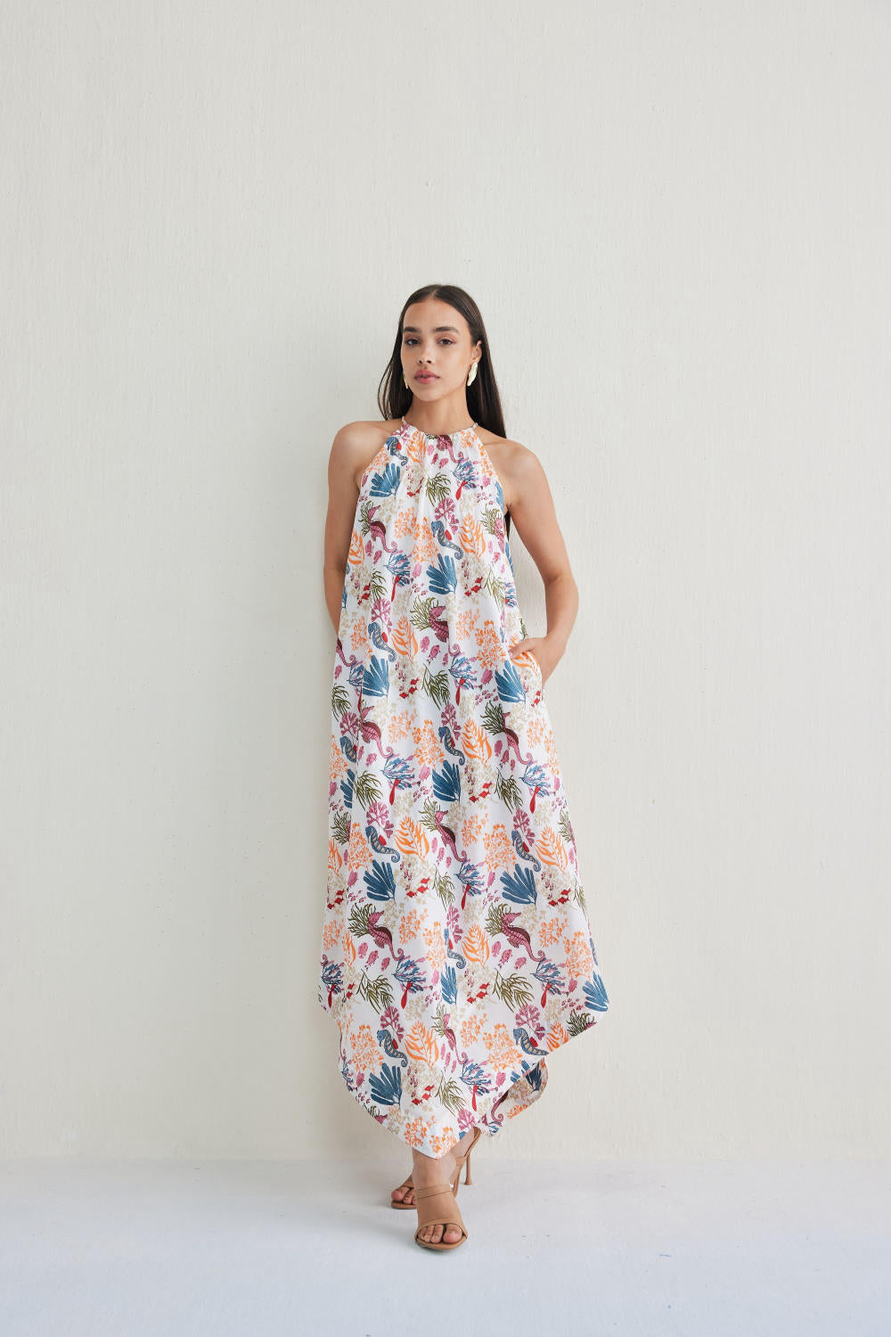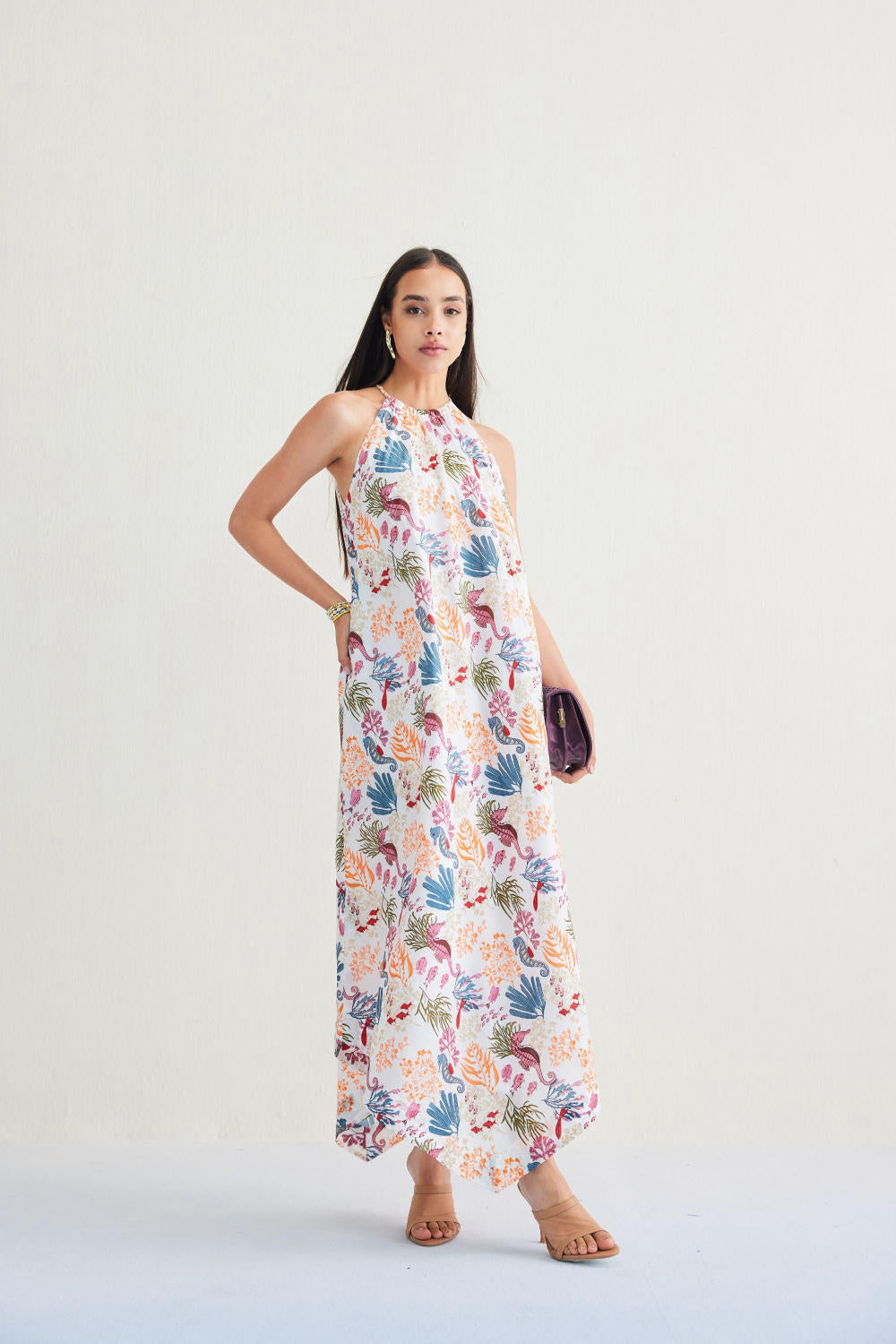Relaxed fit, halter neck, sleeveless, a-line, maxi dress crafted in lyocell fabric, screen printed with our signature ocean life inspired motif using azo-free dyes.