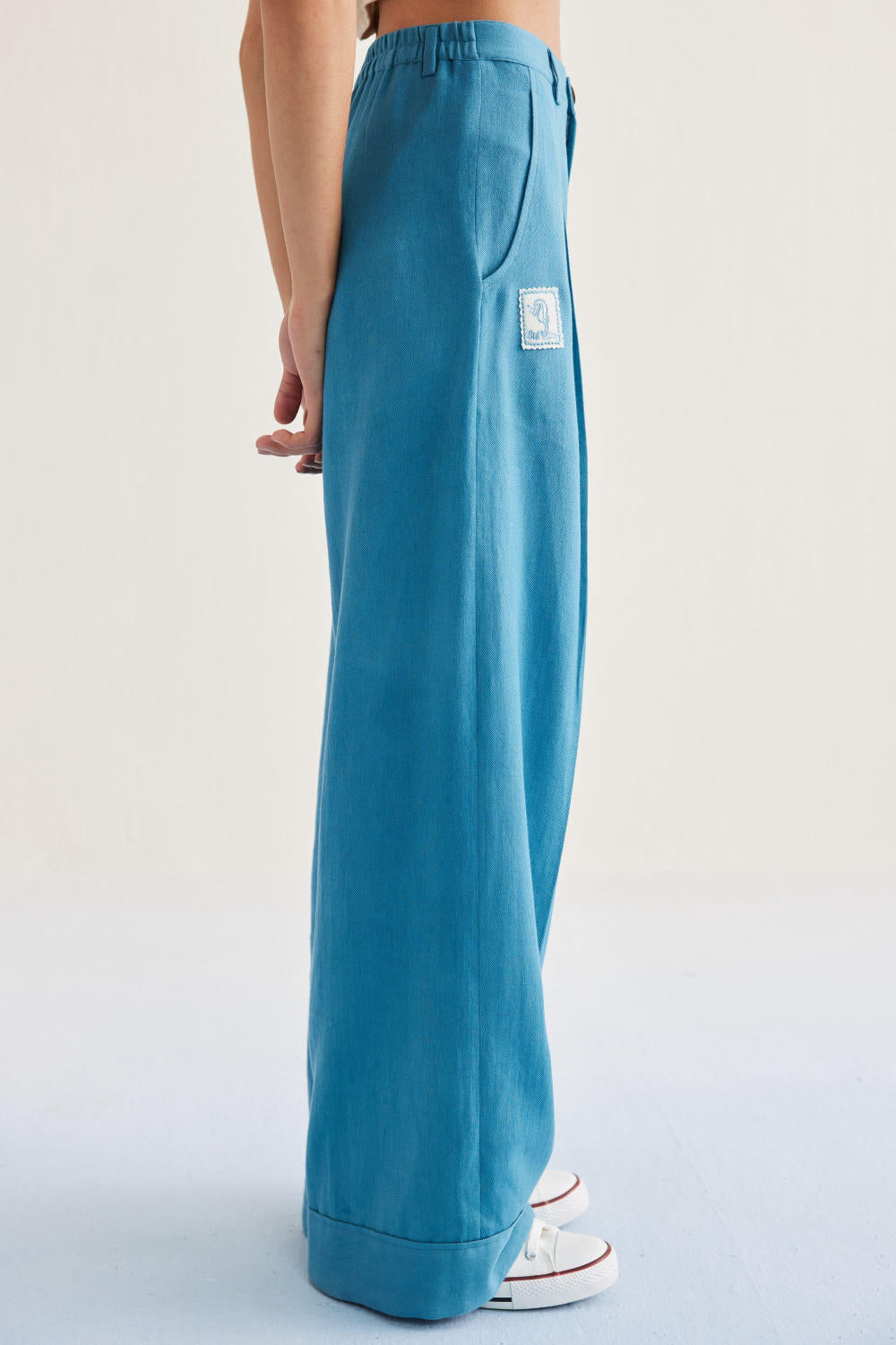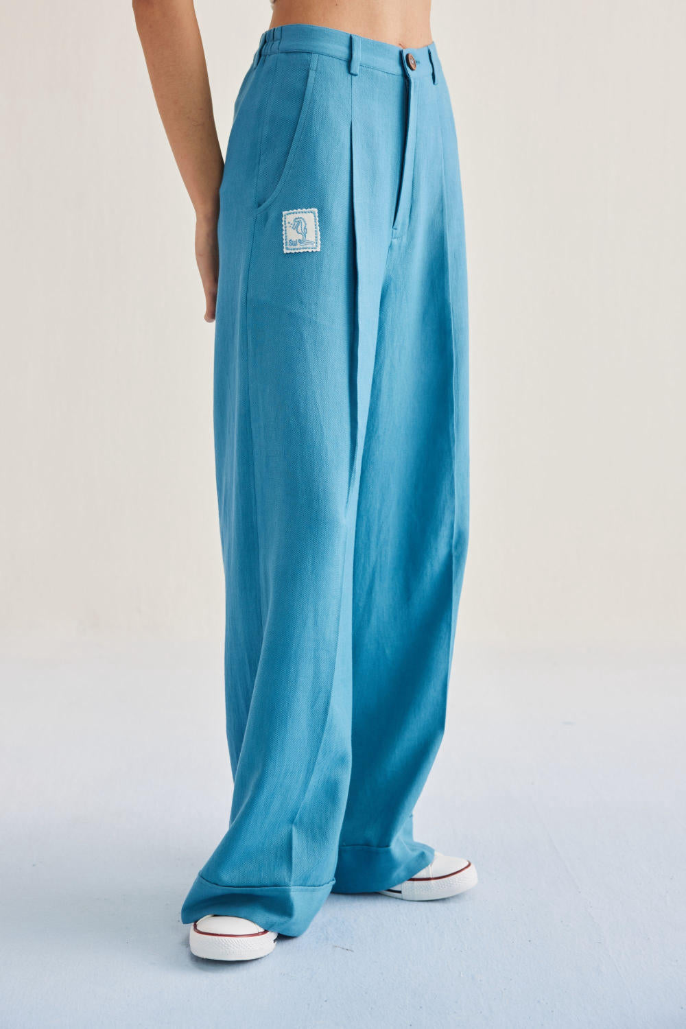Regular fit, wide-leg trousers that buttons at the waist, crafted in azo-free dyed, handwoven organic cotton twill fabric, hand embroidered with a seahorse stamp motif.