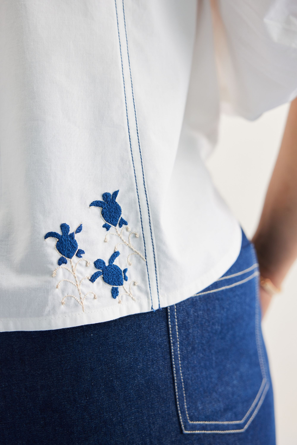 Relaxed fit, half puff sleeve, round-neck top crafted in organic cotton poplin fabric, hand embroidered with starfish and turtle motifs.