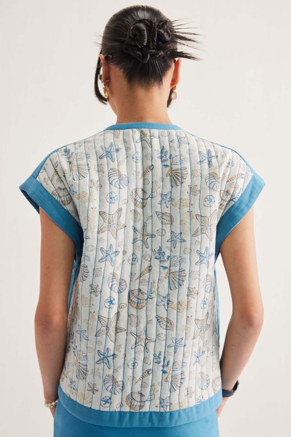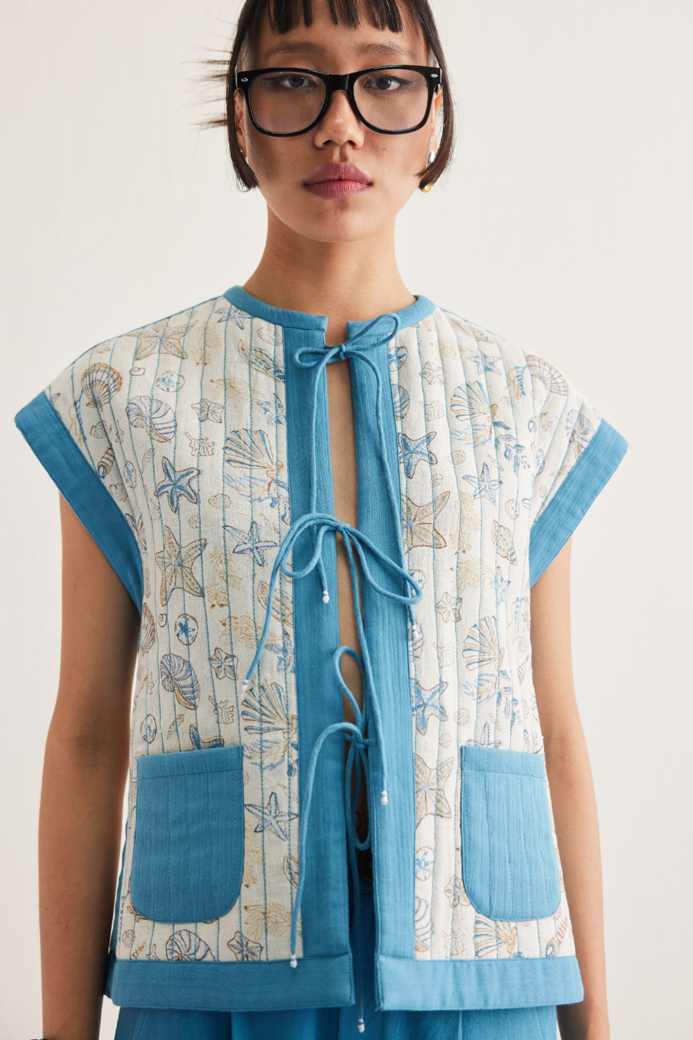 Regular fit, short sleeve, reversible vest top with pockets that fastens at the front with drawstrings, crafted in two fabrics - one is a blue azo-free dyed double gauze organic cotton, the other is a handspun and handwoven Kala cotton fabric that's hand block printed with our signature ocean life inspired motif using azo-free dyes.