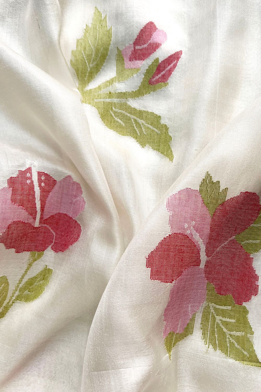 Handwoven silk jamdani sari with thin golden zari border and in Hibiscus motifs, woven using azo-free dyed yarns.