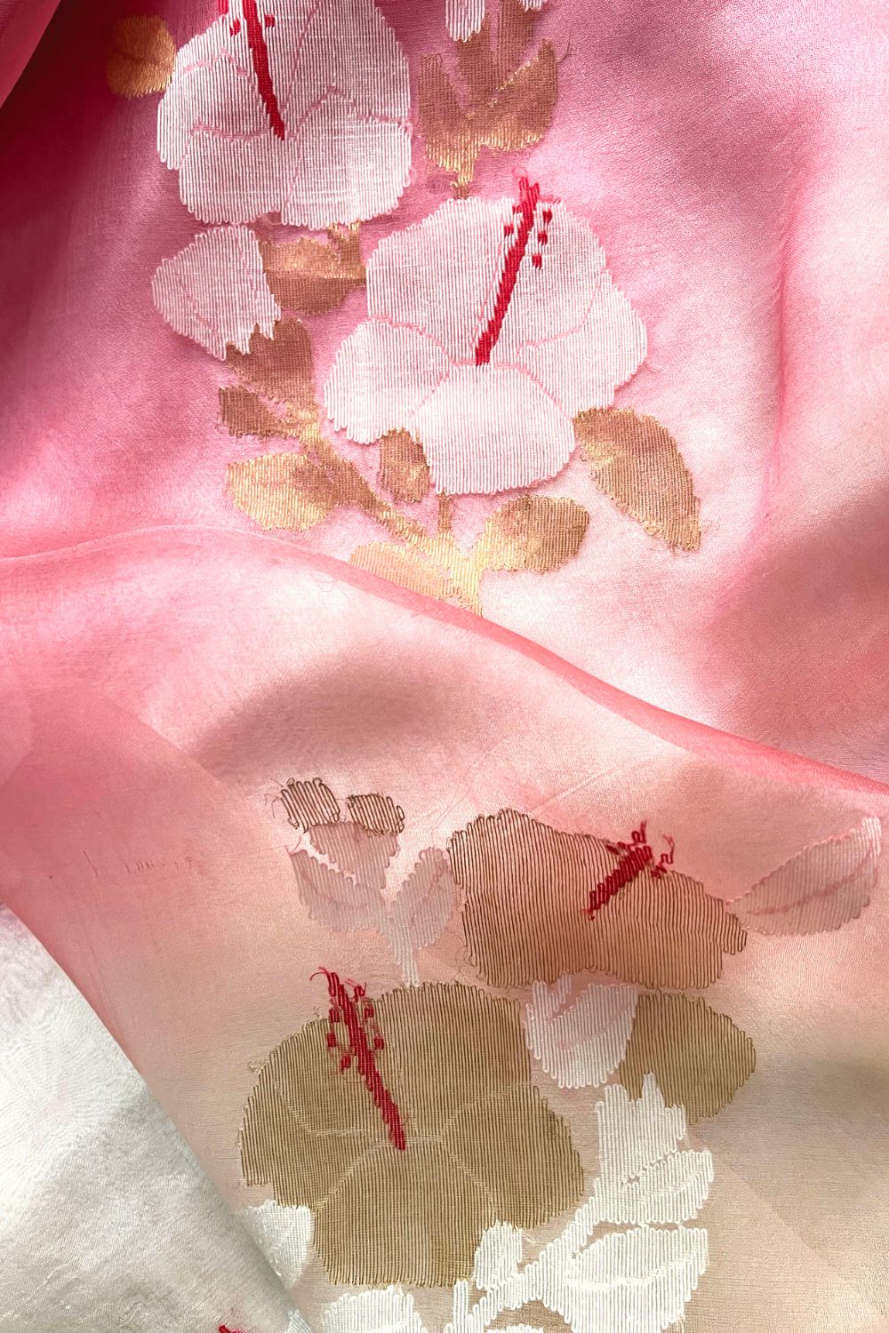 Handwoven silk jamdani sari with thin golden zari border and in Hibiscus motifs, woven using azo-free dyed yarns.