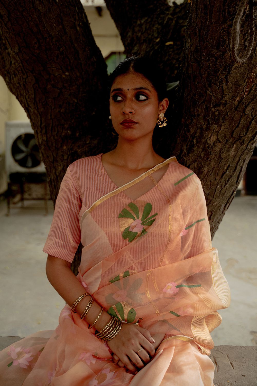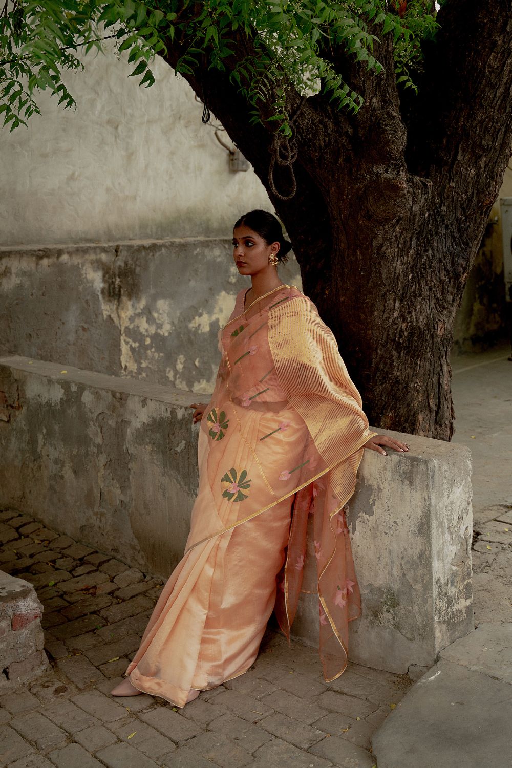 Handwoven silk jamdani sari with thin golden zari border and in lotus motifs, woven using azo-free dyed yarns.
