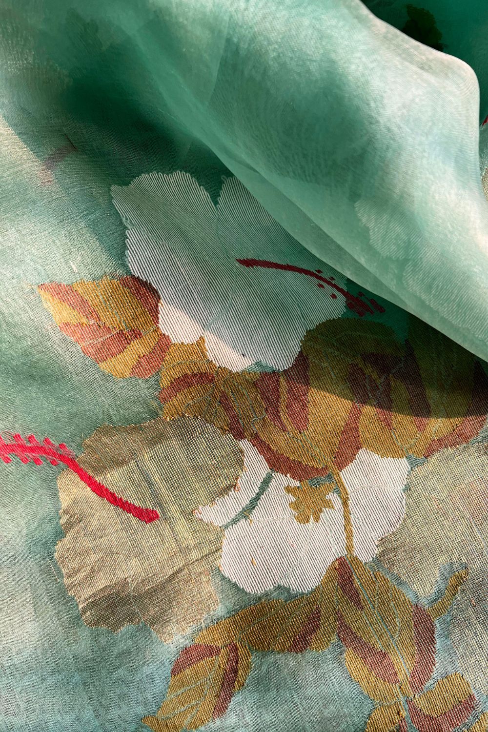 Handwoven silk jamdani sari with thin golden zari border and in Hibiscus motifs, woven using azo-free dyed yarns.