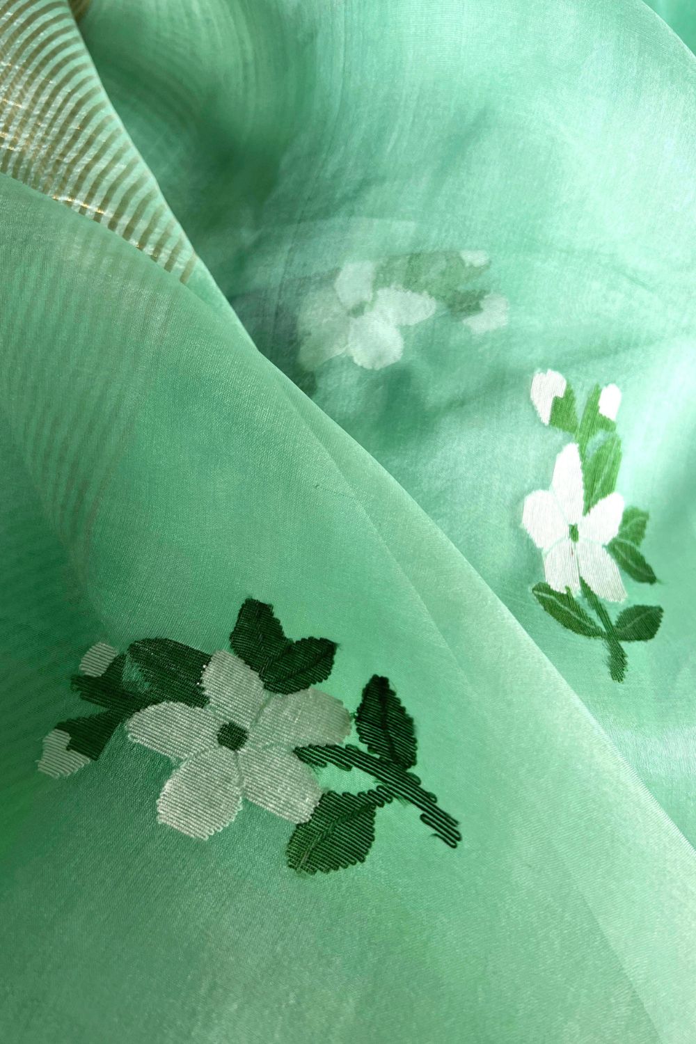 Handwoven silk jamdani sari with thin golden zari border and in jasmine motifs, woven using azo-free dyed yarns.