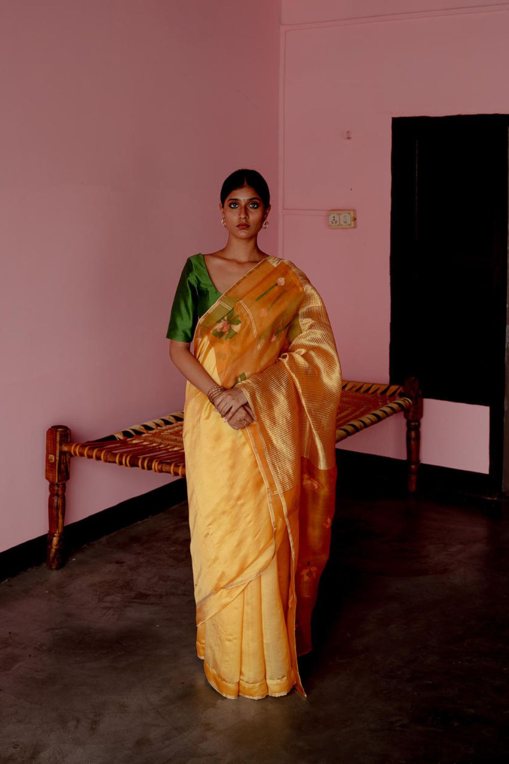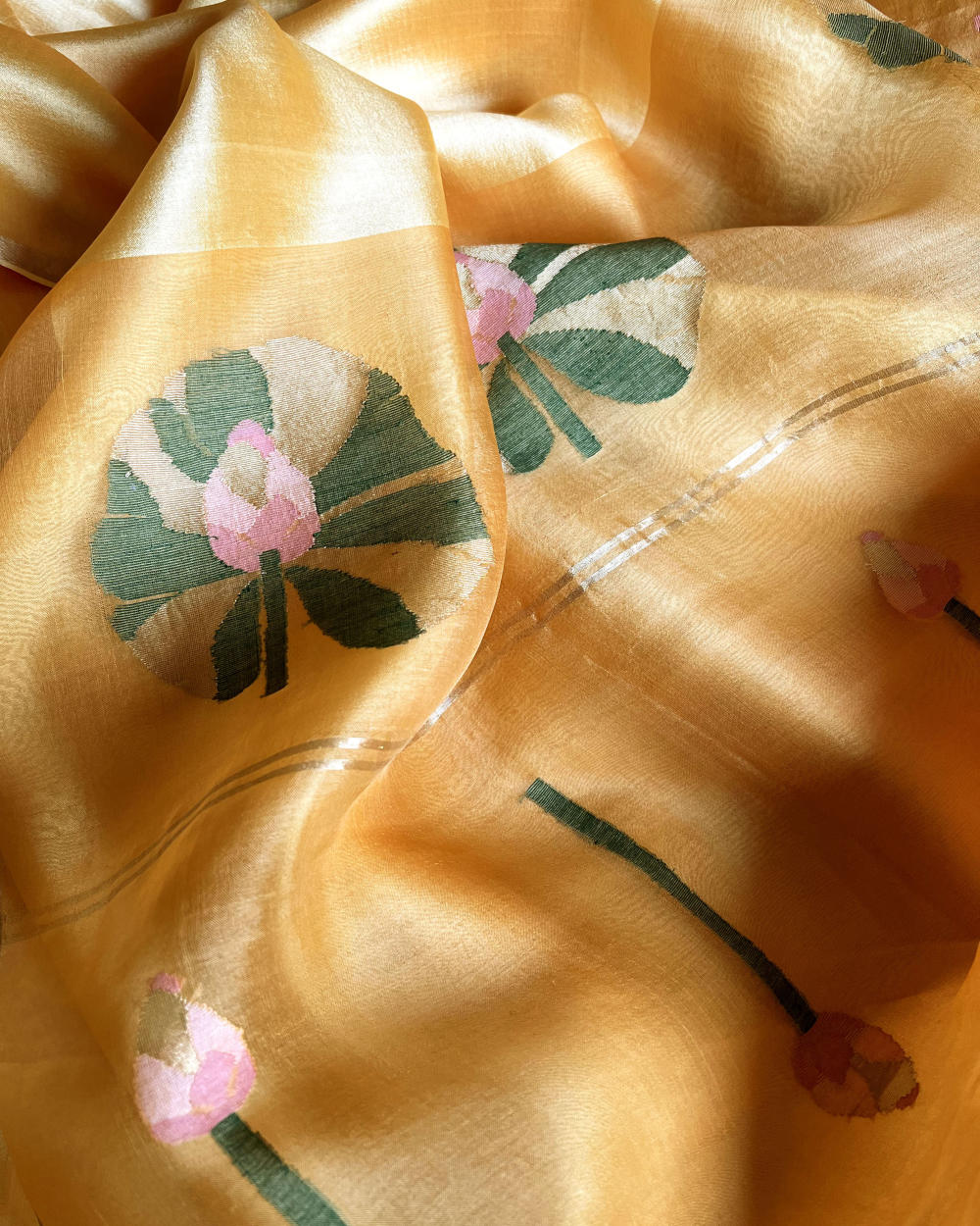 Handwoven silk jamdani sari with thin golden zari border and in lotus motifs, woven using azo-free dyed yarns.