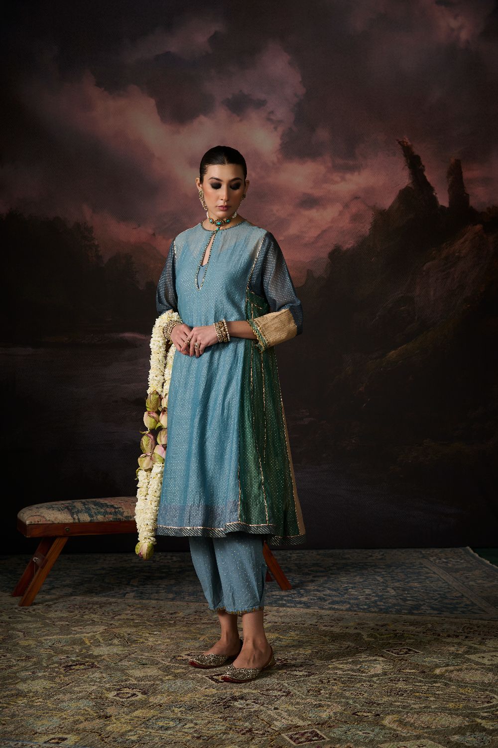 Her Chanderi carries its signature translucence and soft sheen, but with a subtlety that feels almost ethereal — printed slowly, consciously, through hand block printing that heightens the fabric's inherent delicacy.