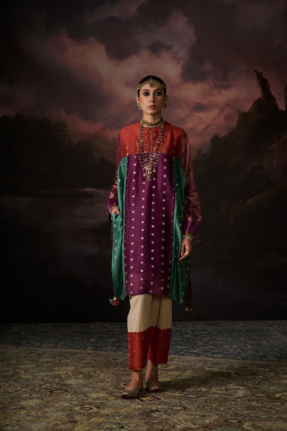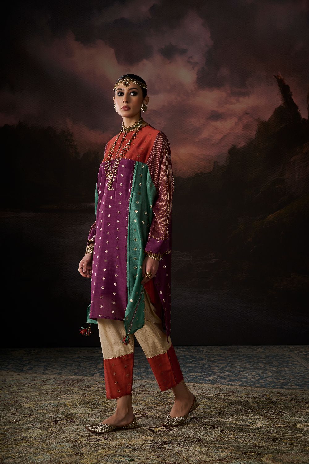 Banarasi Chanderi Brocade & Handwoven Chanderi Zari Stripe Paneled, Color-Blocked Kaftan, Hand Embellished With Fine Embroidery and Tassels Made From Upcycled Katran Fabric