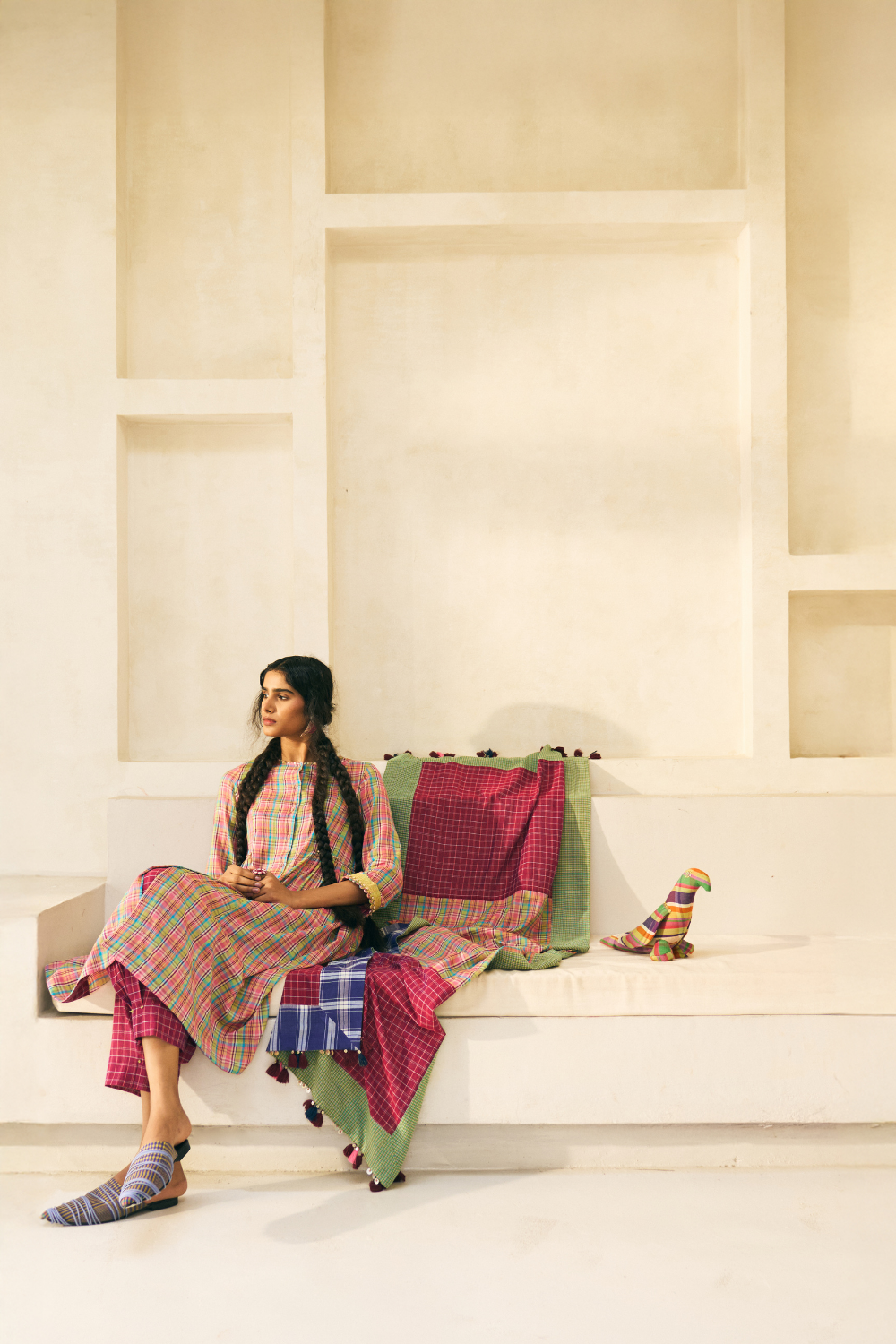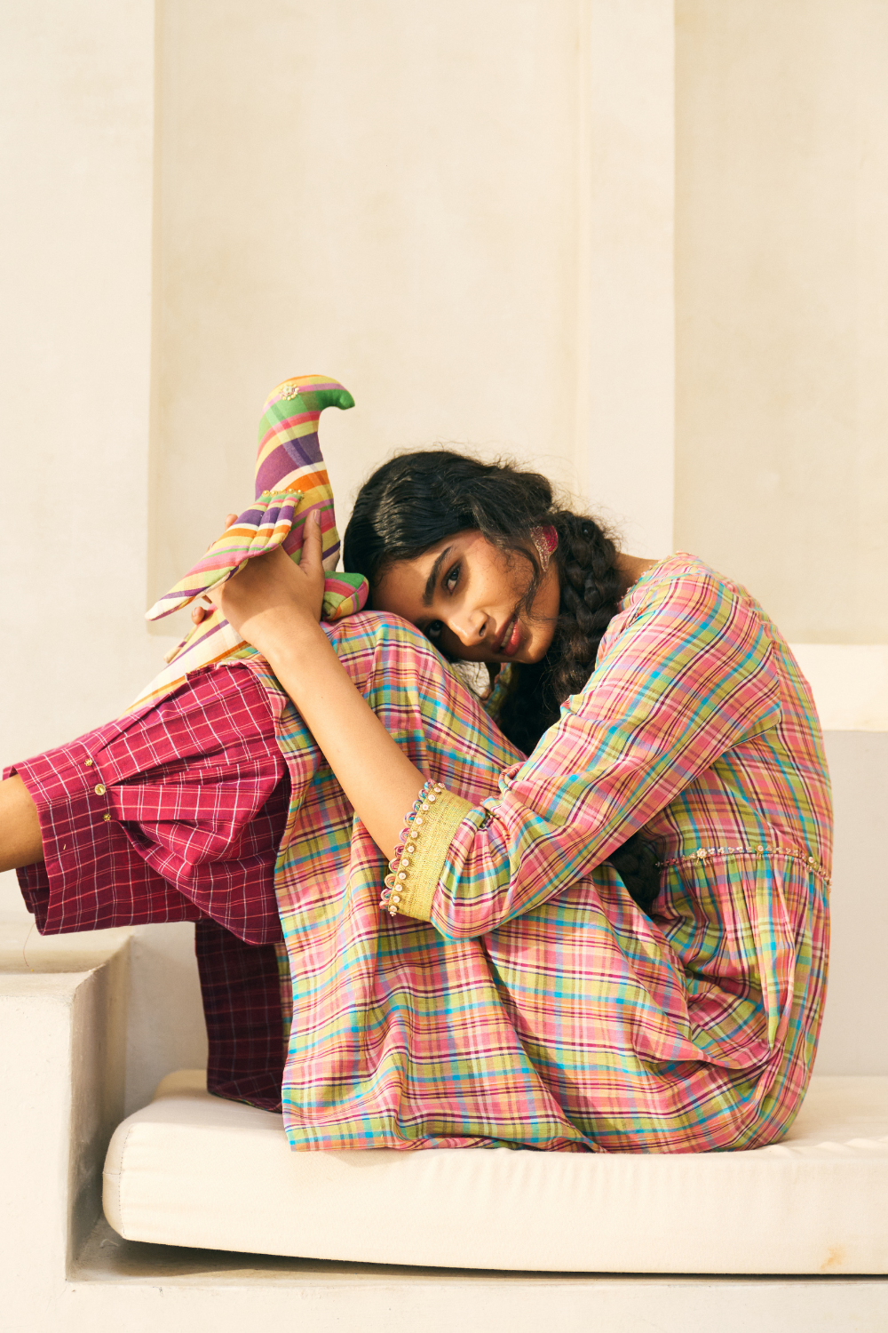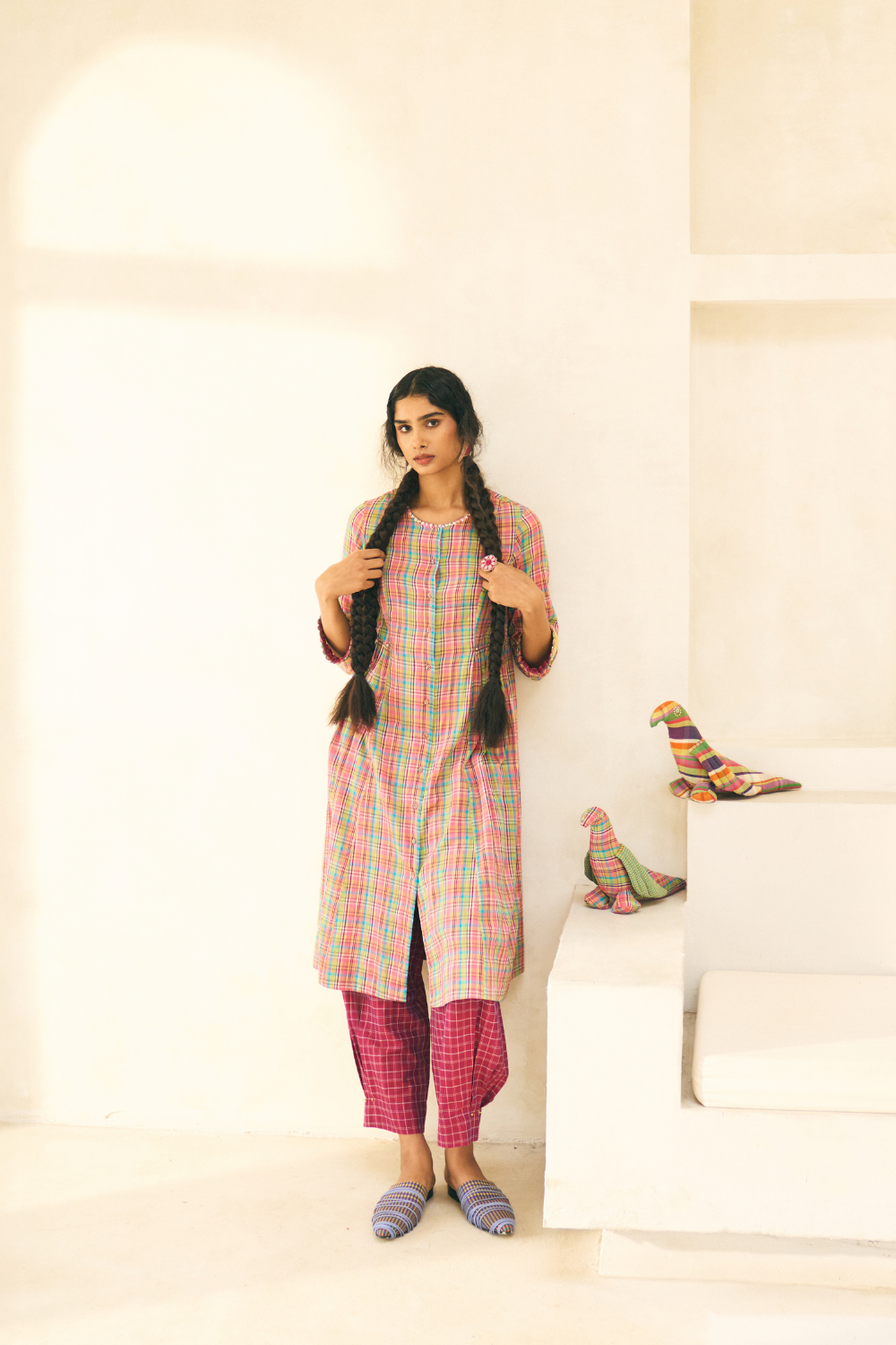 Kurta with a front button opening, enhanced with hand-done beadwork, crafted in handwoven yarn-dyed 100% bengal cotton irregular punch pink check.