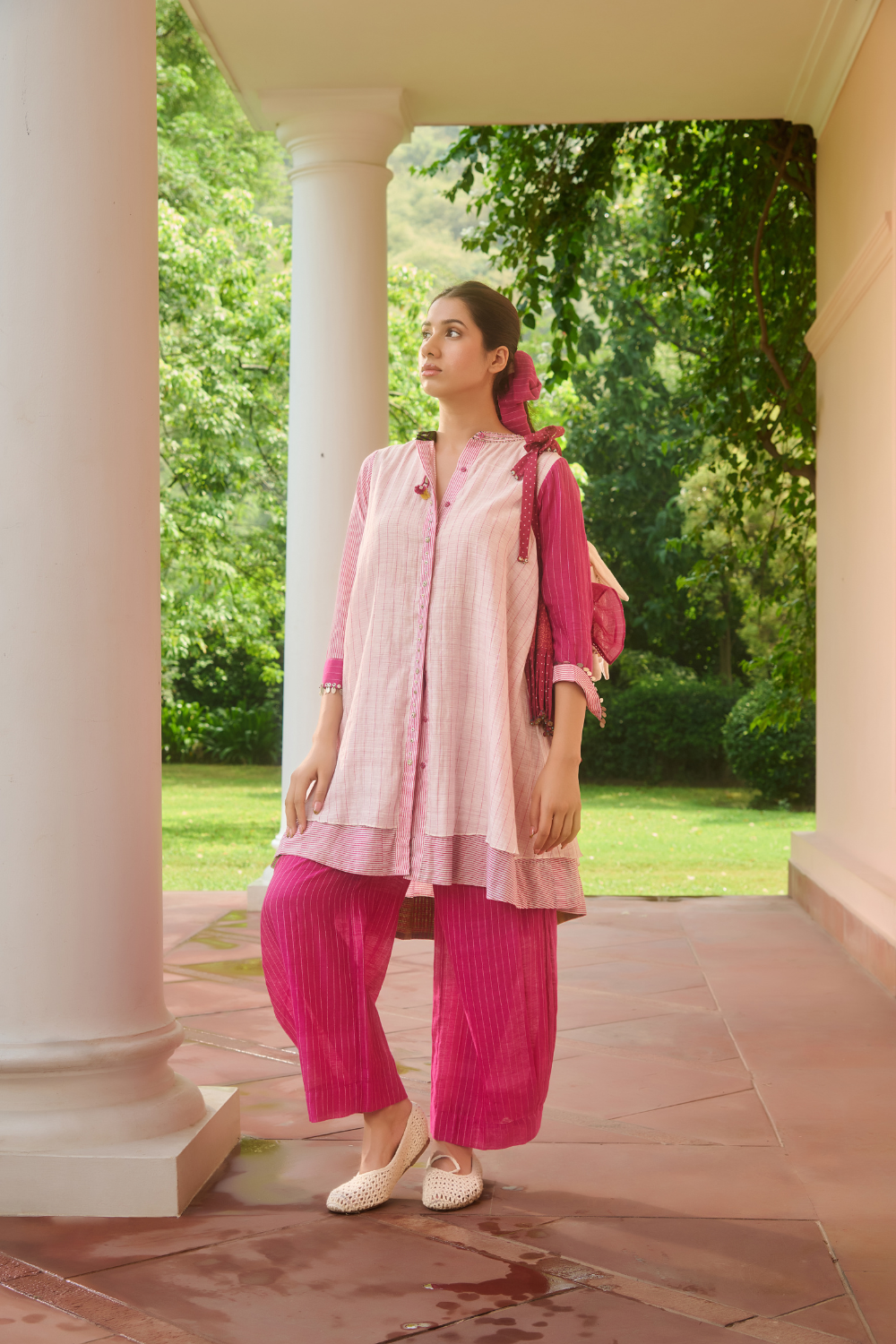 Swatti’s design language is anchored in India’s most storied textiles — Chanderi, handwoven cotton, and hand block-printed fabrics — yet her approach is unmistakably contemporary. She doesn’t simply use these textiles; she interprets them. She listens to their history, then rewrites their place in the modern wardrobe.