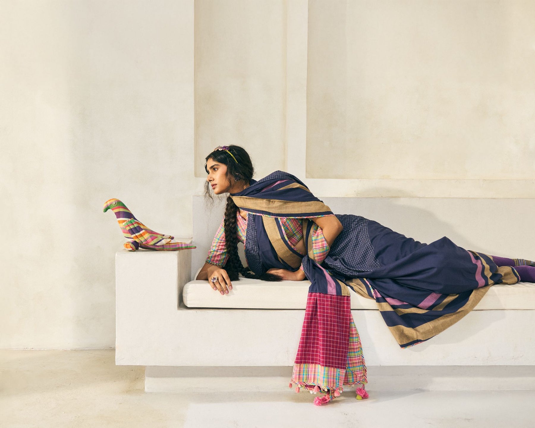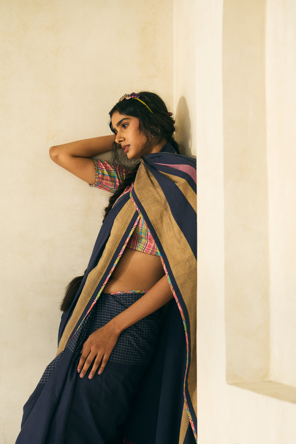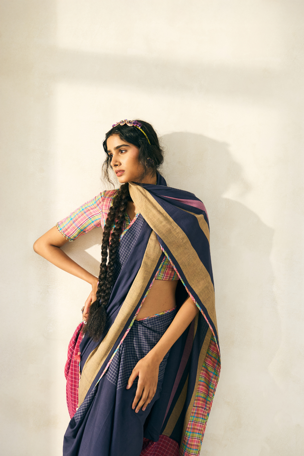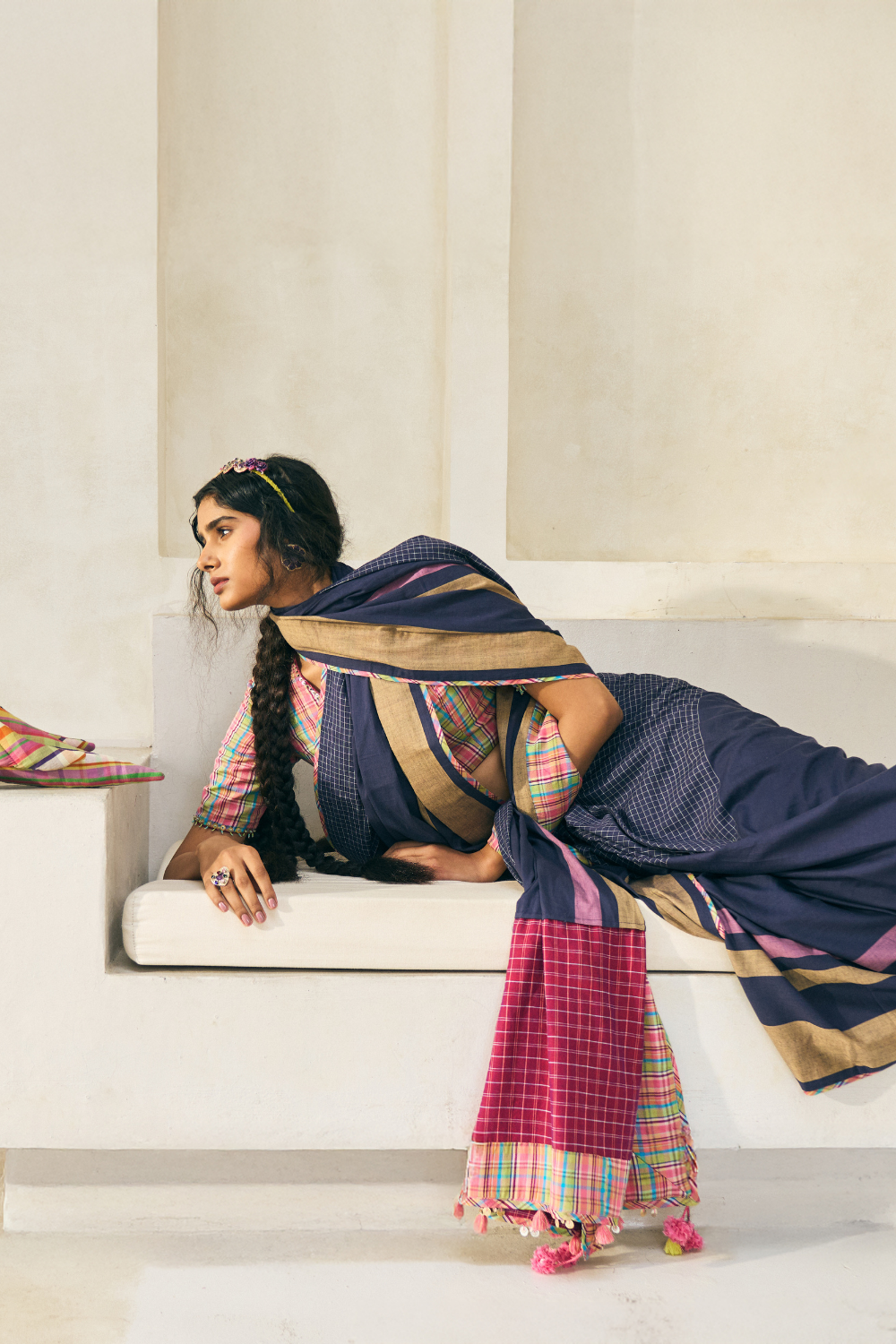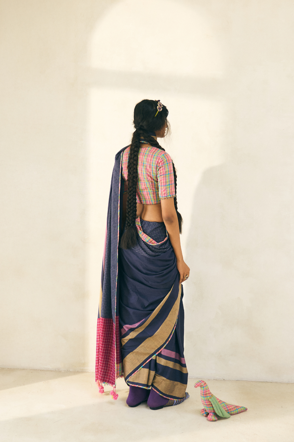 Fabric: Handwoven Yarn-Dyed Bengal 100% Cotton Sari In Twilight Blue With A Garnet Maroon Check Palla And A Punch-Pink Check Thin Border.