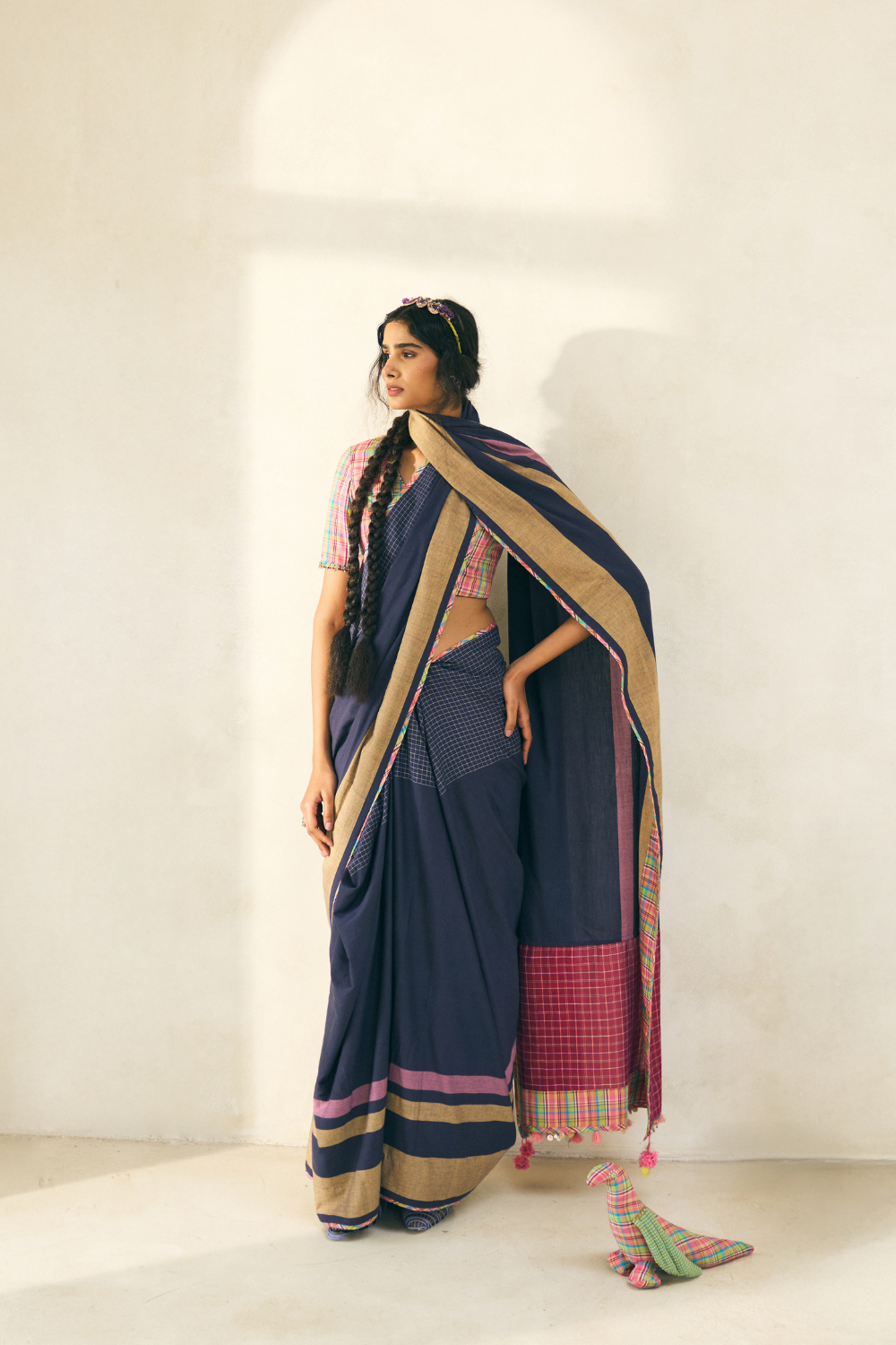 Sari with a garnet maroon check palla, punch-pink check thin border, hand-done beadwork, and tassel detail, crafted in handwoven yarn-dyed Bengal 100% cotton in twilight blue.