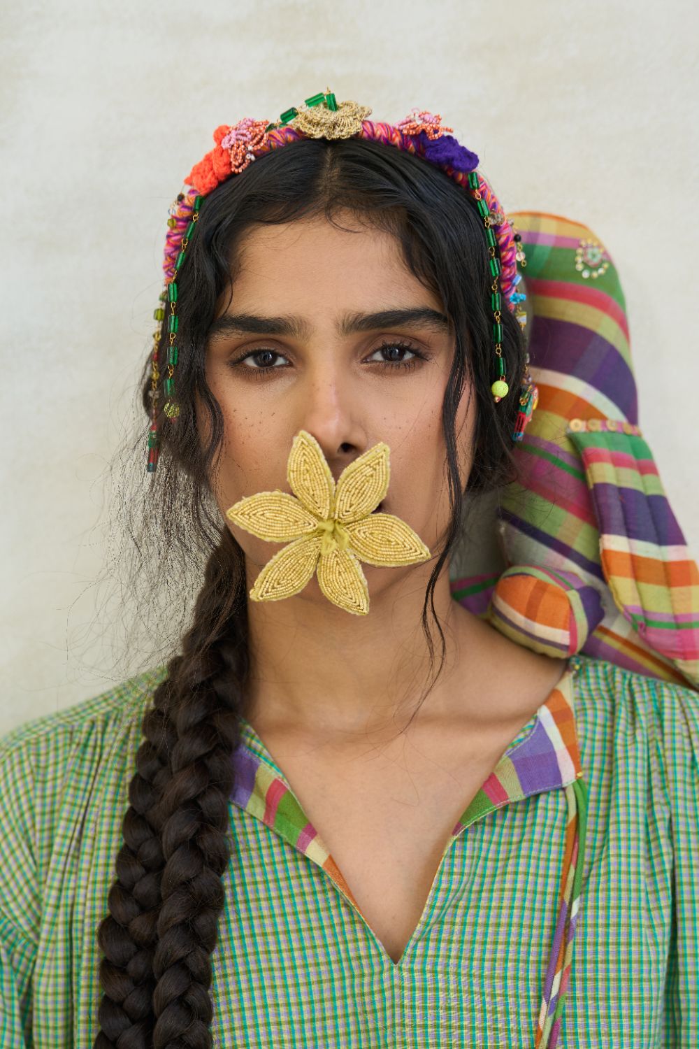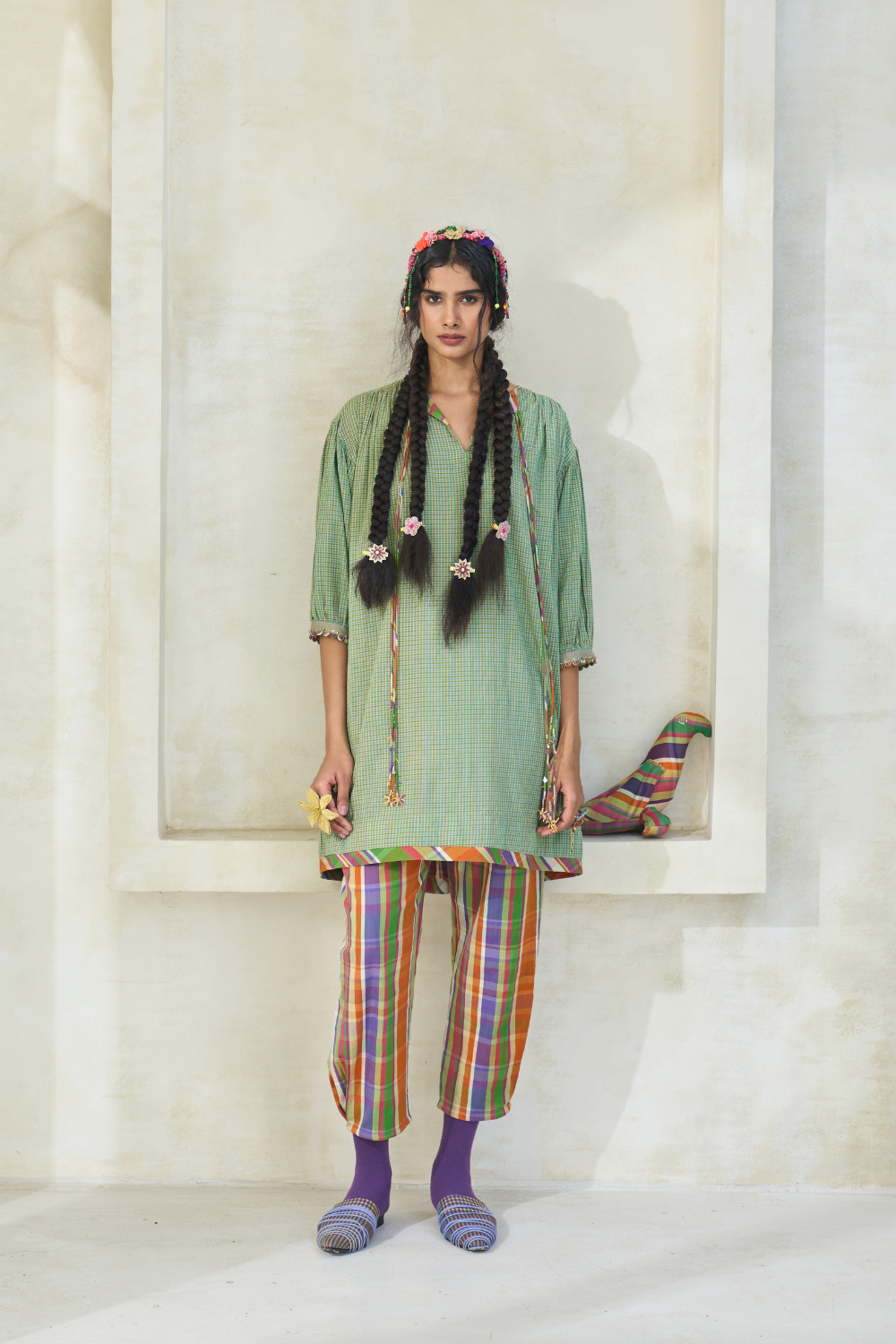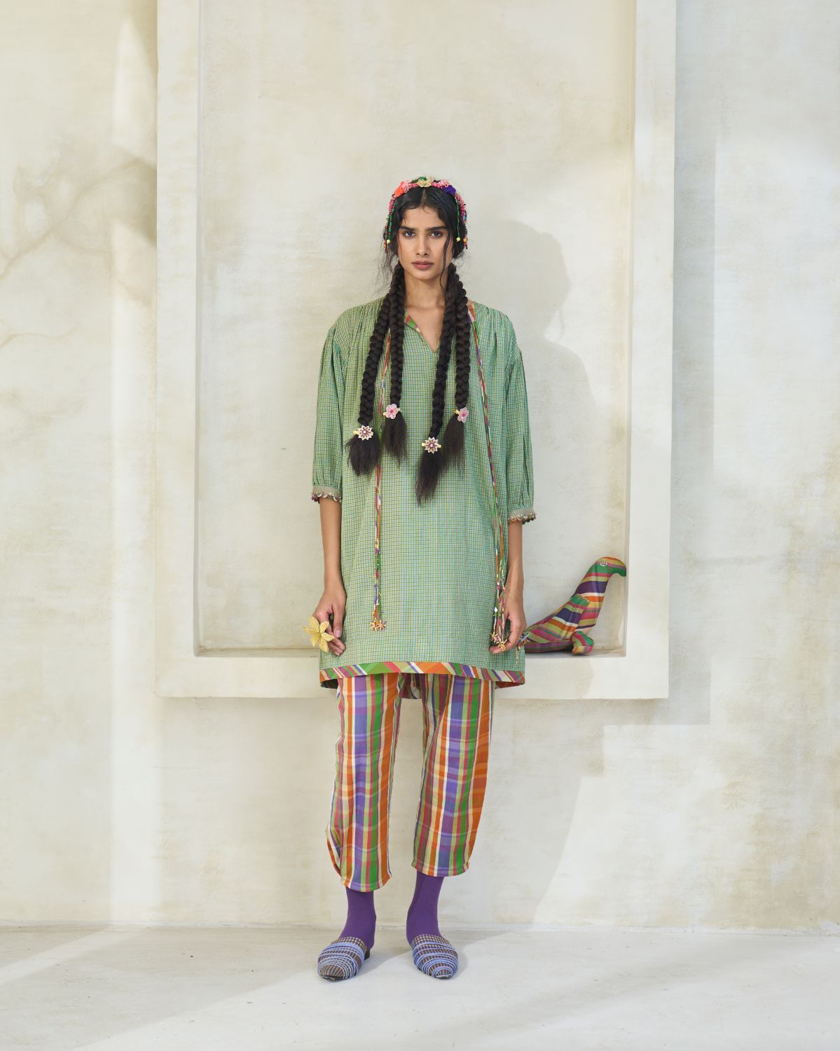 Tunic with dori details, beaded tassels, and hand-beaded neckline and cuffs, in Handwoven yarn-dyed Bengal 100% cotton small checks finished with a multicolor check border.