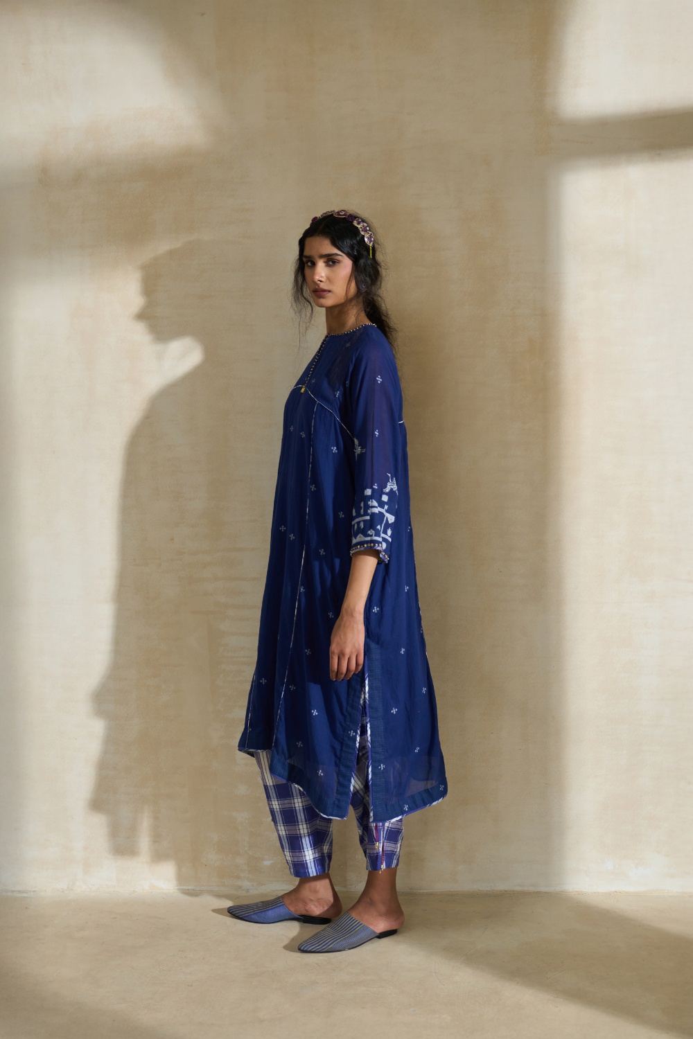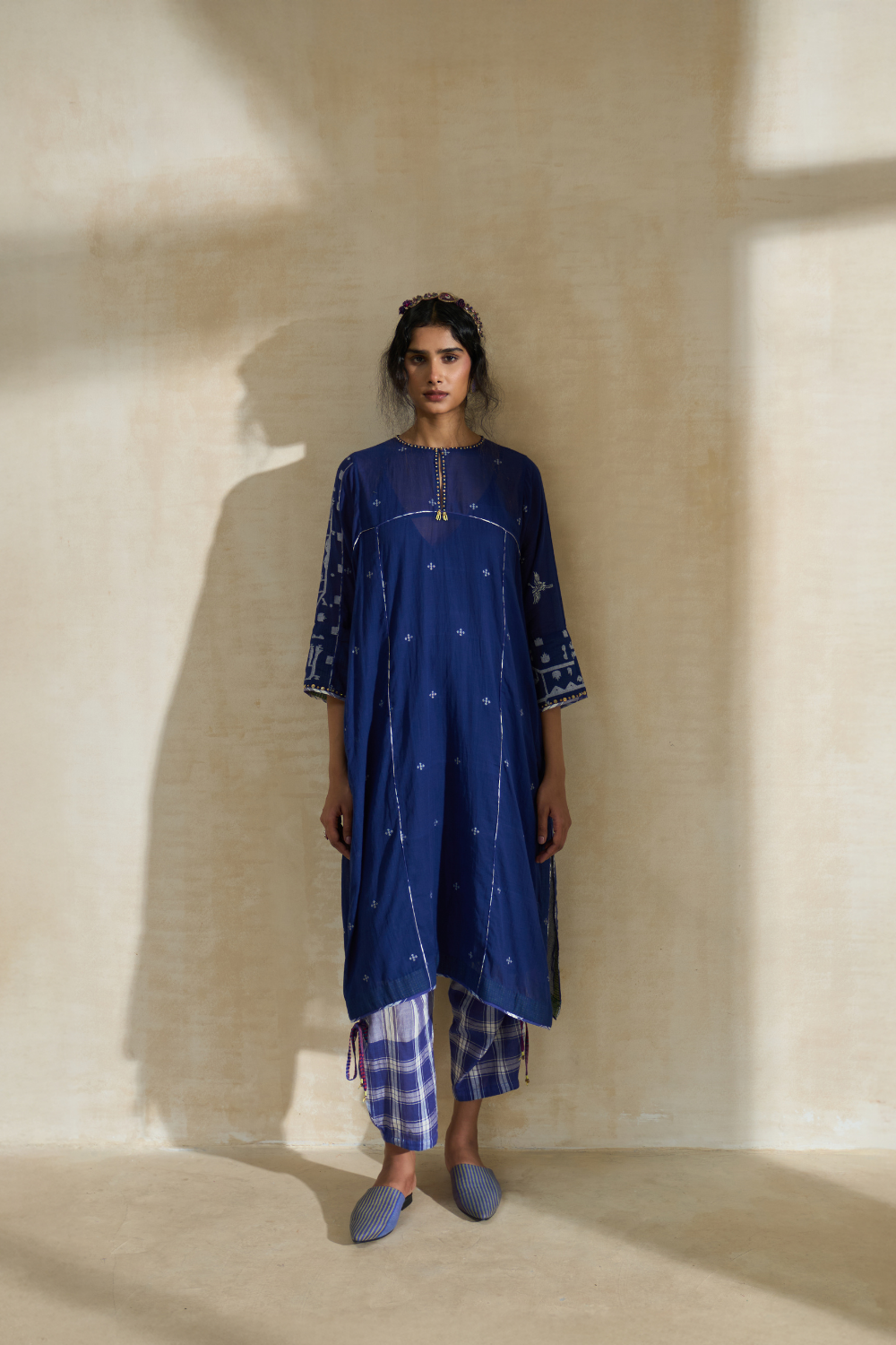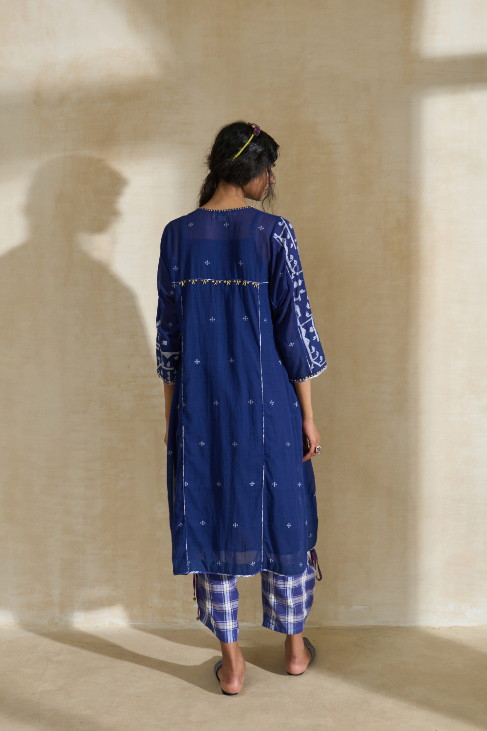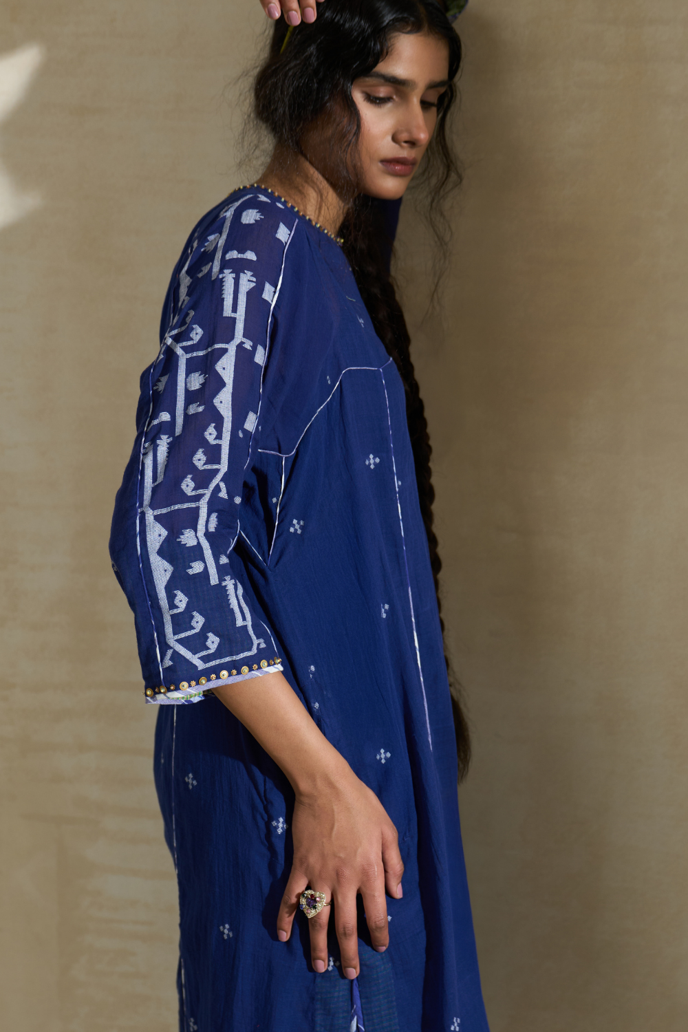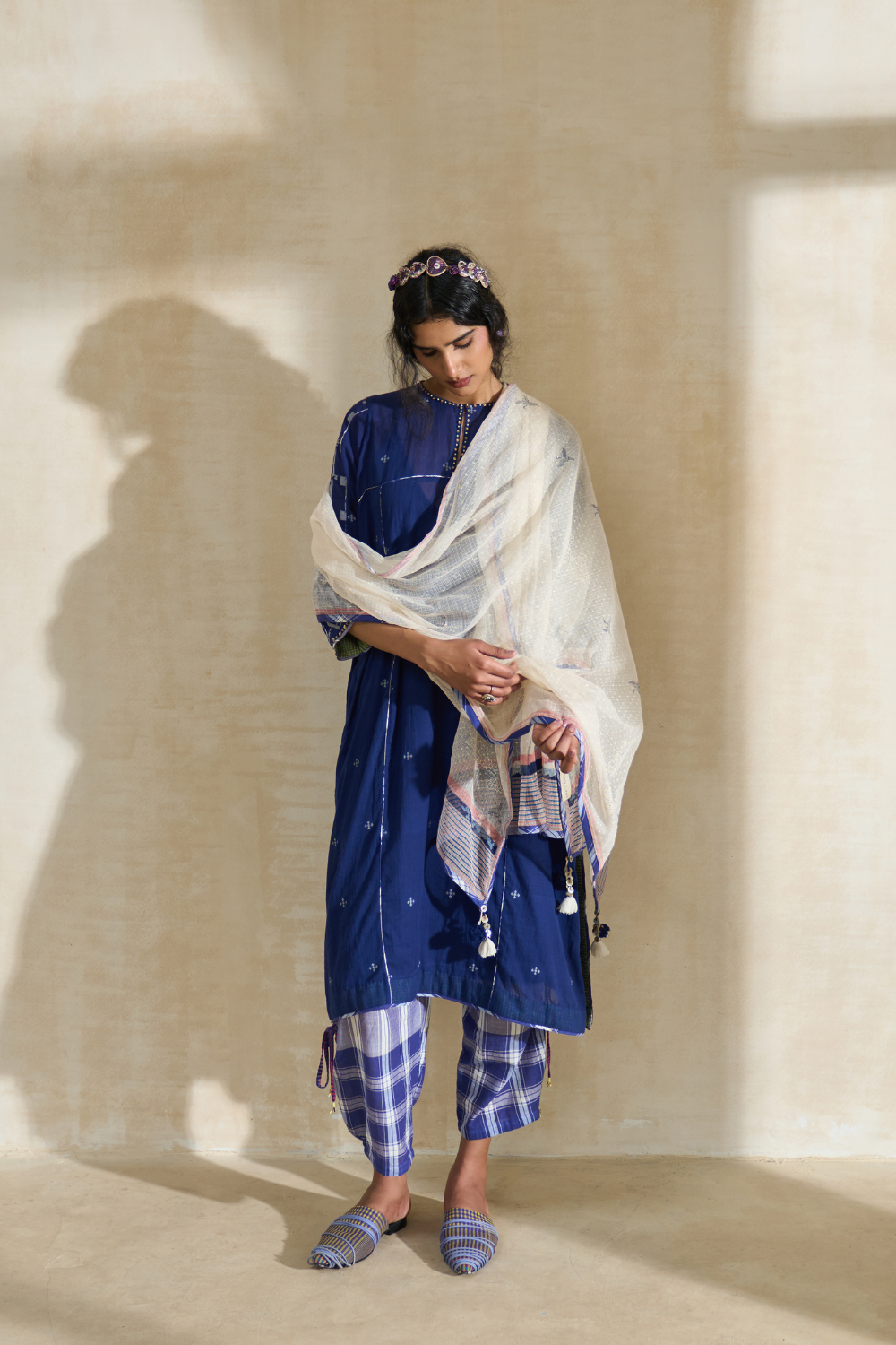 Kurta with rounded, hand-beaded neckline in handwoven Bengal cotton Jamdani butti kurta, finished with delicate embroidery, a Jamdani border, check piping, and a cotton slip.