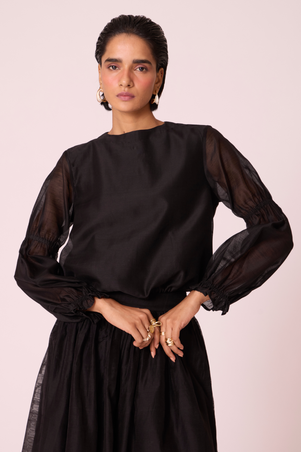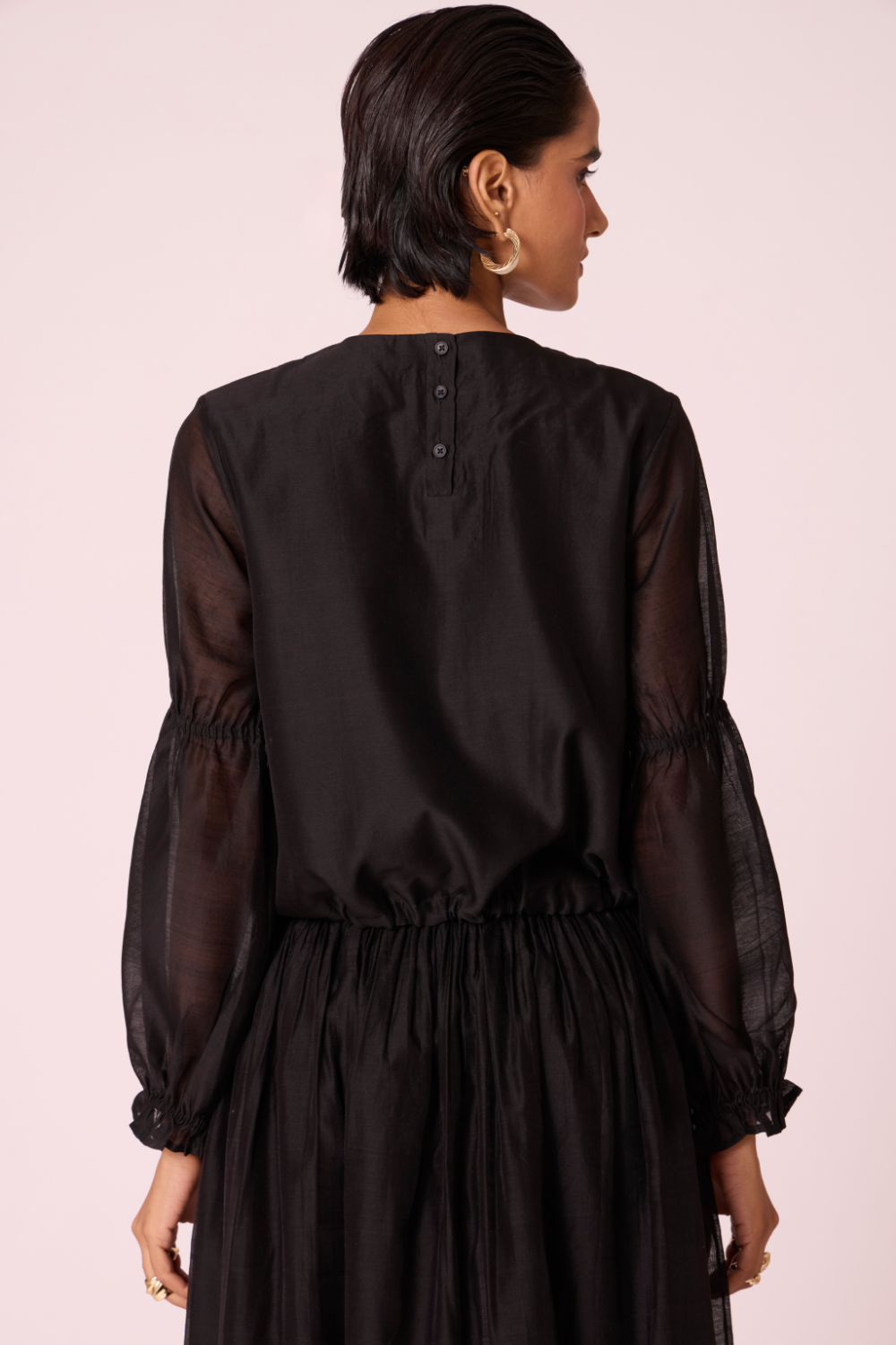 A refined silhouette in luminous Chanderi, the Atlas top is shaped with a subtle drawstring waist that allows the form to shift with intention. Elasticated sleeve details and a clean back fastening bring measured structure to a piece that moves effortlessly between everyday and festive wear.