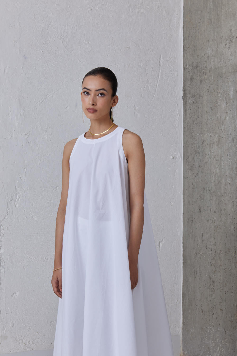 Midi dress with bounteous flare featuring a slight high low hem. Modern high neckline with cutaway shoulders. Pairs well with a belt too. Inseam pockets.