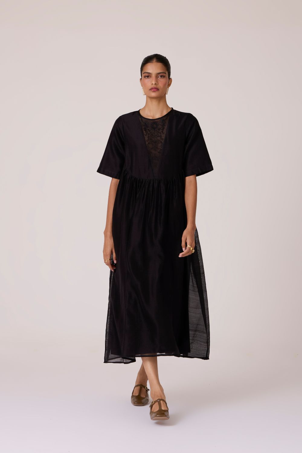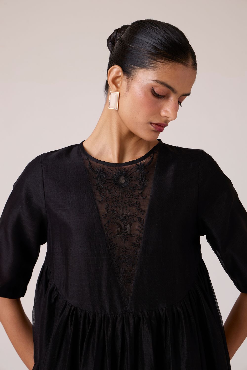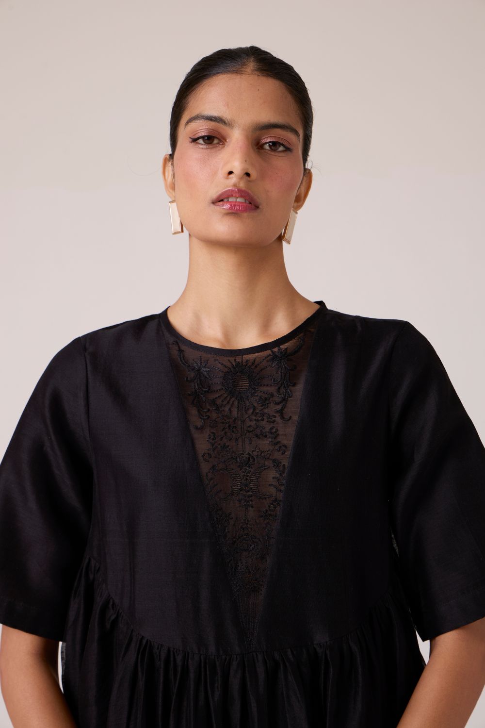 - Sheer embroidered panel at neckline
