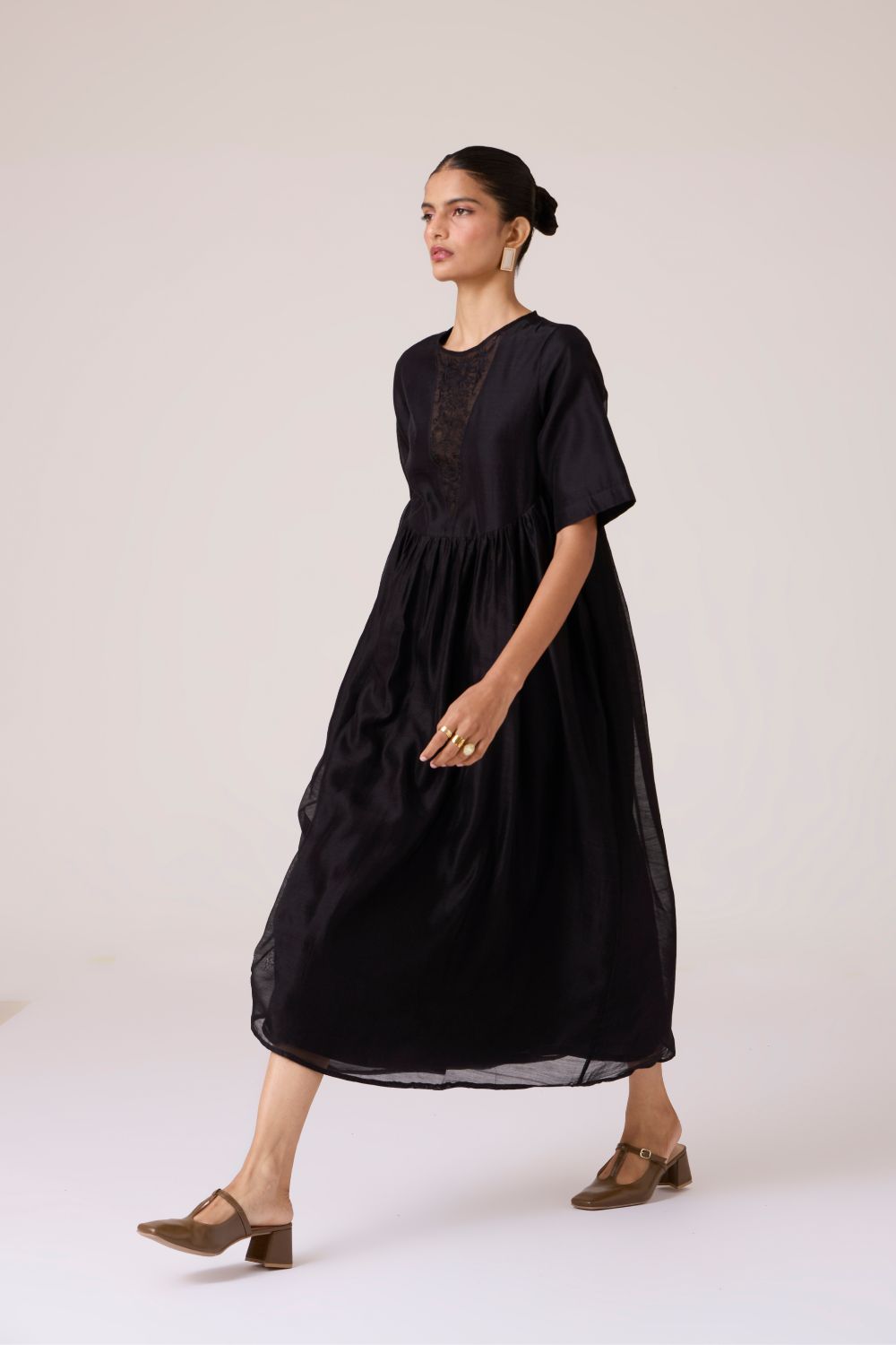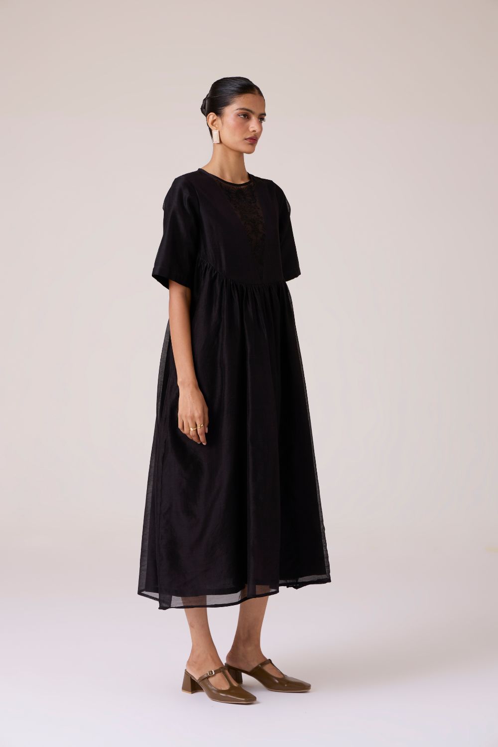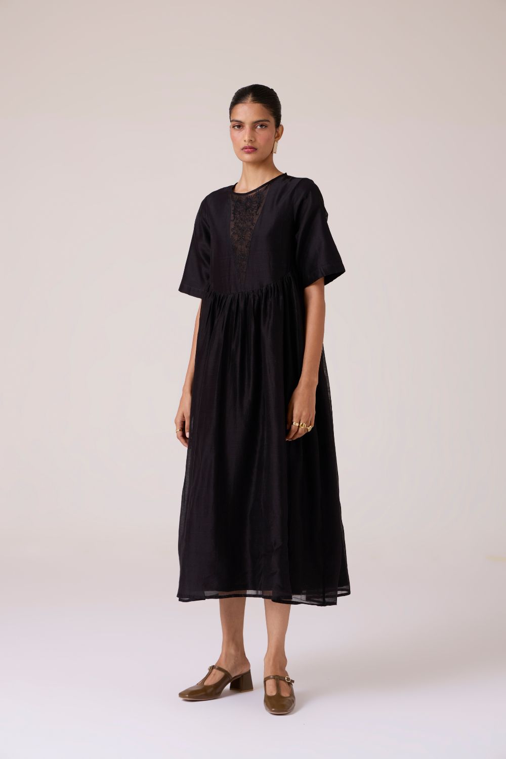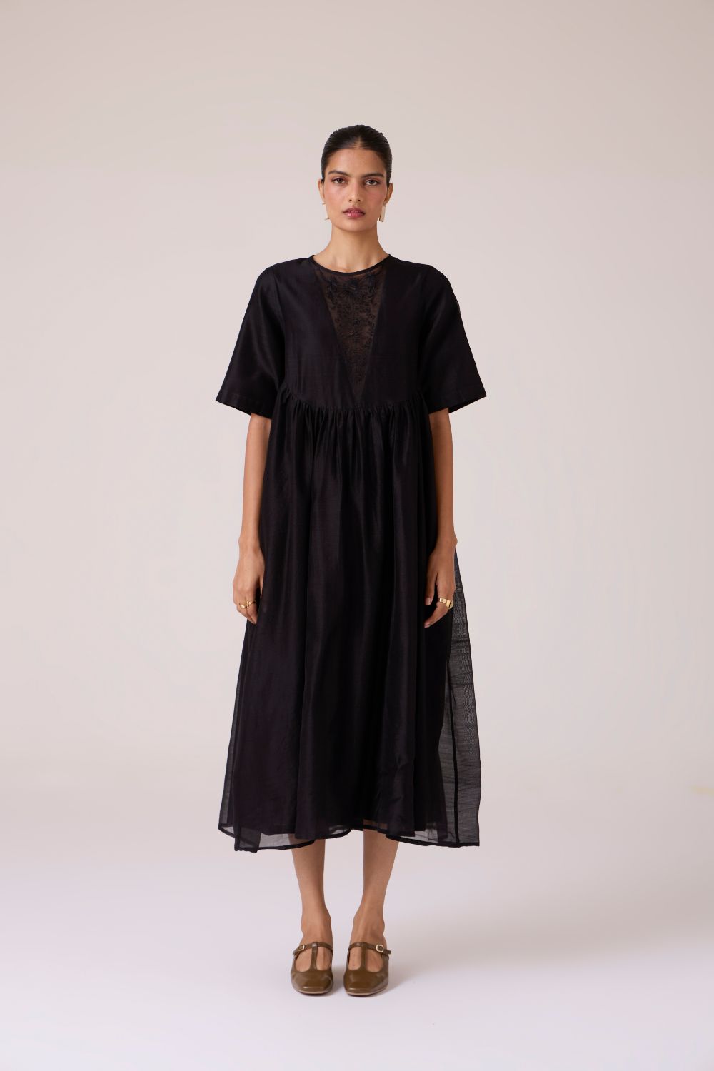 - Sheer embroidered panel at neckline