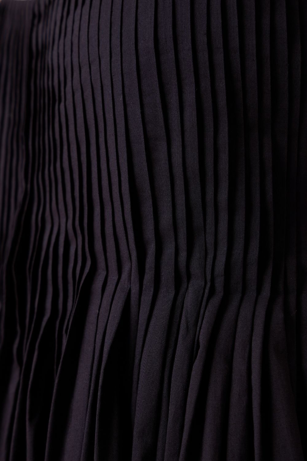 - Sharp pleats at neckline flowing into flare